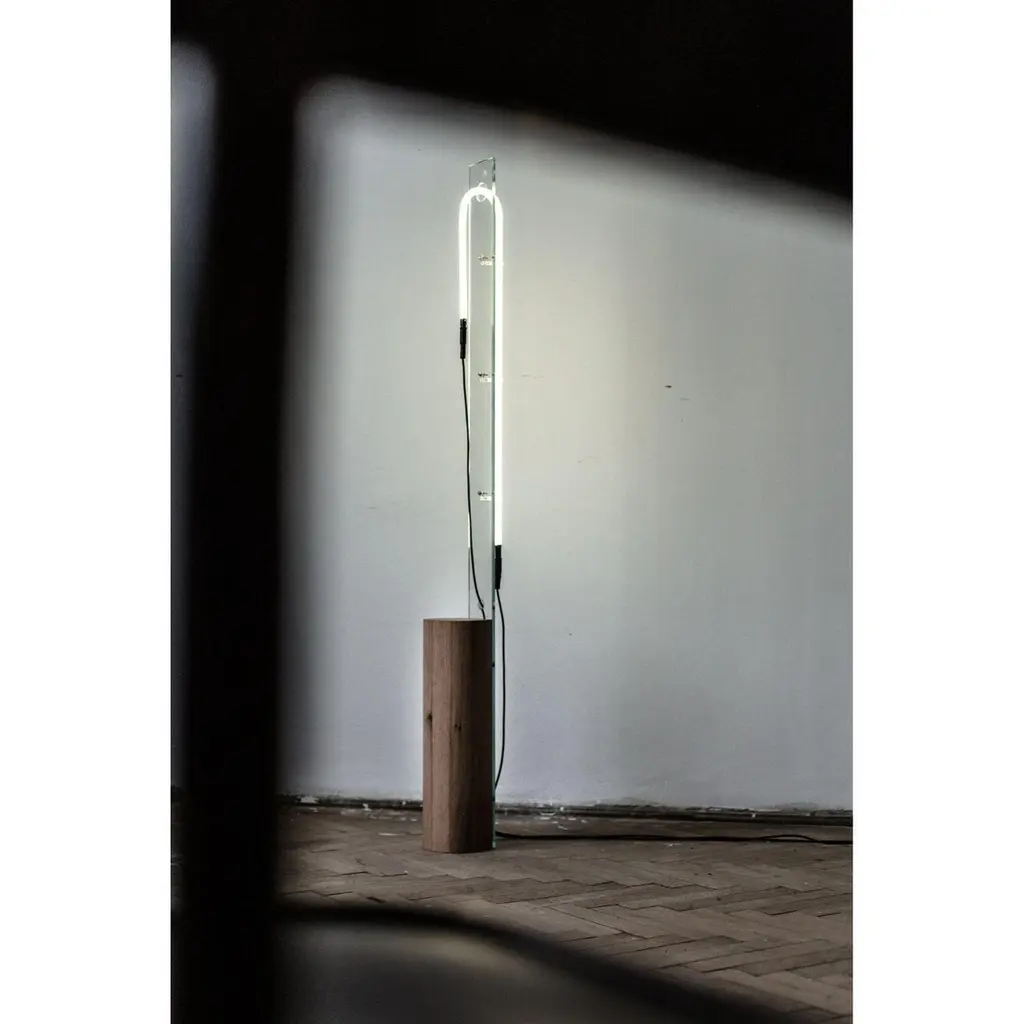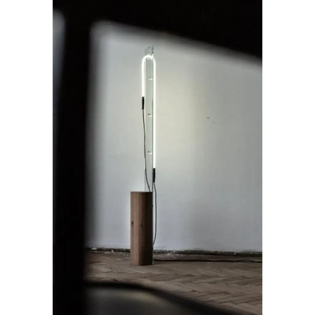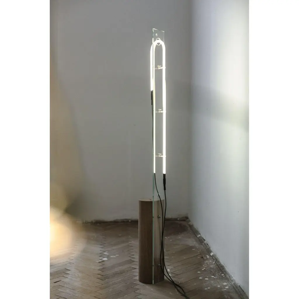 8 minutes straight by Radu Abraham.Materials: Oak wood, glass, custom made light tubeDimensions: 15 x 15 x 170 cm.All our lamps can be wired according to each country. If sold to the USA it will be wired for the USA for instance.The base is made out of a massive oak cylinder, that holds the glass on which the light tube stands. Each of the elements that compound the object is detachable.Inspired by geometrical shapes and ratios, with simple lines and clean composition, Radu Abraham is always looking for ways to experiment with the objects he is creating, through different contrasts, by color or by associating various materials with different properties. In Radu Abraham's design approach he is interested in exploring Craft, this being part of his signature.