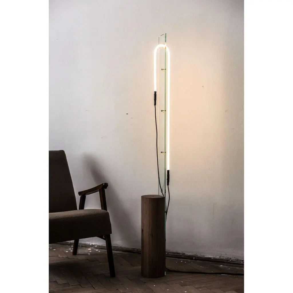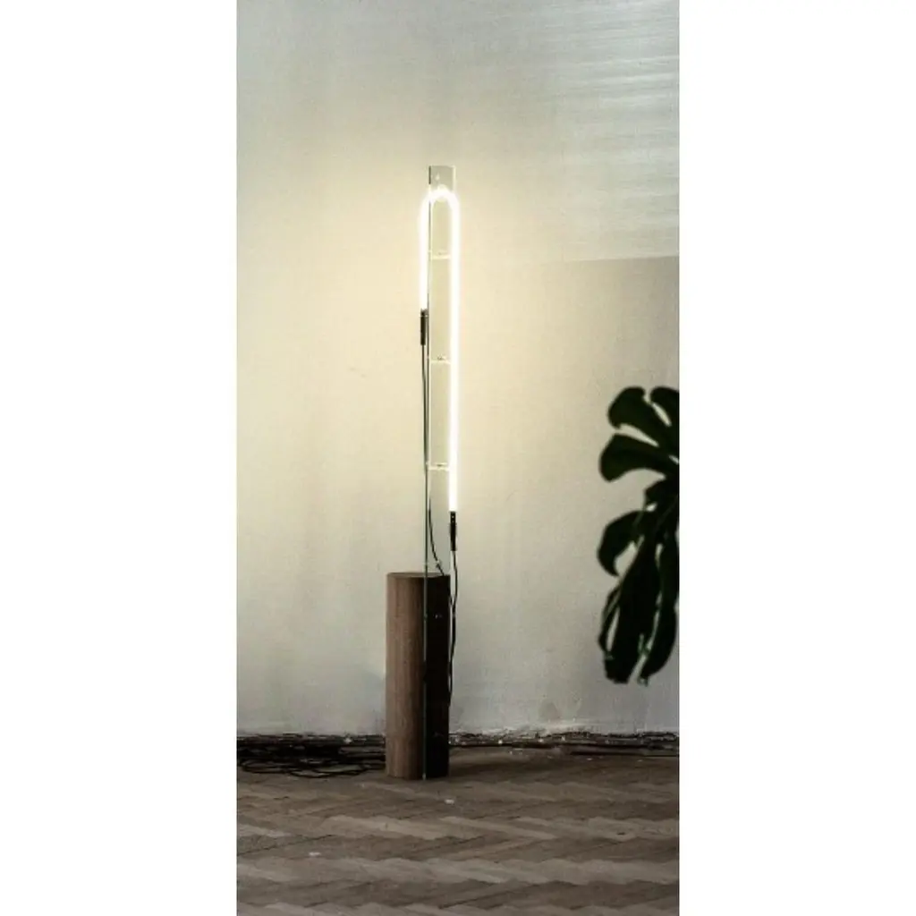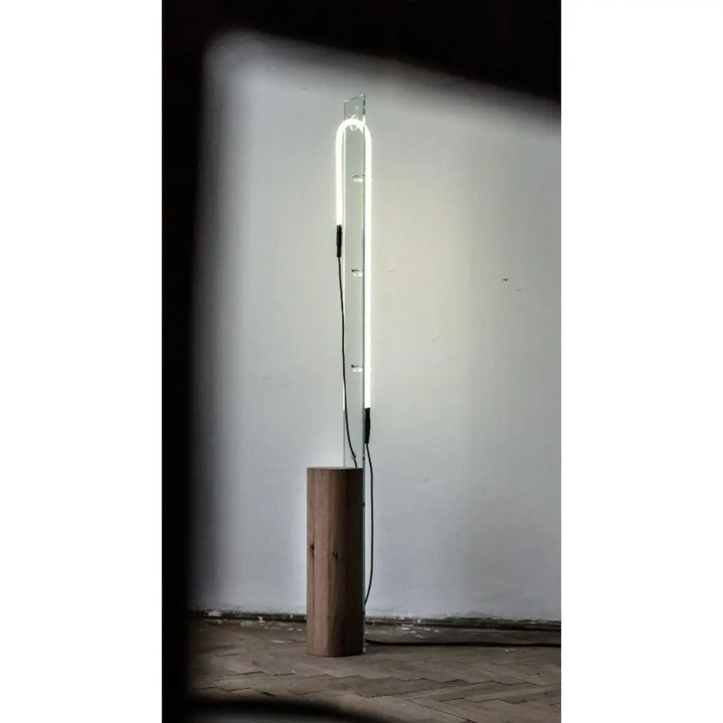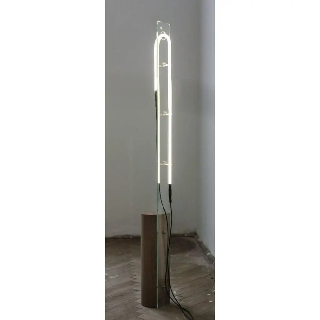 8 minutes straight by Radu Abraham.Materials: Oak wood, glass, custom made light tubeDimensions: 15 x 15 x 170 cm.All our lamps can be wired according to each country. If sold to the USA it will be wired for the USA for instance.The base is made out of a massive oak cylinder, that holds the glass on which the light tube stands. Each of the elements that compound the object is detachable.Inspired by geometrical shapes and ratios, with simple lines and clean composition, Radu Abraham is always looking for ways to experiment with the objects he is creating, through different contrasts, by color or by associating various materials with different properties. In Radu Abraham's design approach he is interested in exploring Craft, this being part of his signature.