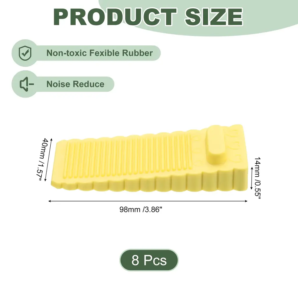 Description :Anti-Slip Overlay Design - The door stopper can be directly overlay to match larger gaps; and has a double-sided anti-slip function, with a horizontal stripe design on the surface, which increases the friction with the door and can easily fix the position of the door. The bottom hollowed-out anti-slip design keeps the door stable on the floor, with even force distribution during use, and is not easy to move.Material - The door stoppers for the bottom of the door are made of TPR, soft and non-slip, they will not scratch the surface of the floor or door; It has elasticity and can adapt to larger gaps, and can also be used on floors of various materials (wooden boards, ceramic tiles, and so on), and the trapezoidal design also provides cushioning force when closing the door.Easy Using - Place the door stopper on the floor at a suitable distance, which is easy to replace and does not affect cleaning. In addition to being used as a buffer and fixing when opening the door, it can also be used when closing the door to stop it from opening from the outside.Wide Applications - These door stops can be applied to various occasions, such as offices, homes, shops, hotels, etc; These door stops ensure that doors do not accidentally slip and close, so you don't have to worry about the door suddenly closing in winds, protecting the door and walls.Specifications:Material: TPRColor: YellowTotal Size: 98 mm x 40 mm x 14 mm / 3.86 Inch x 1.57 Inch x 0.55 Inch (L*W*H)Package Content:8 Pcs x Door Stoppers