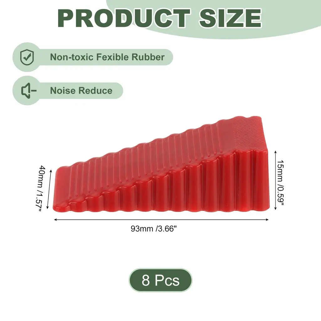 Description :Anti-Slip Design - The door stopper has a double-sided anti-slip function, with a horizontal stripe design on the surface, which increases the friction with the door and can easily fix the position of the door. The bottom hollowed-out anti-slip design keeps the door stable on the floor, with even force distribution during use, and is not easy to move.Material - The door stoppers for the bottom of the door are made of ABS, soft and non-slip, they will not scratch the surface of the floor or door; It has elasticity and can adapt to larger gaps, and can also be used on floors of various materials (wooden boards, ceramic tiles, and so on), and the trapezoidal design also provides cushioning force when closing the door.Easy Using - Place the door stopper on the floor at a suitable distance, which is easy to replace and does not affect cleaning. In addition to being used as a buffer and fixing when opening the door, it can also be used when closing the door to stop it from opening from the outside.Wide Applications - These door stops can be applied to various occasions, such as offices, homes, shops, hotels, etc; These door stops ensure that doors do not accidentally slip and close, so you don't have to worry about the door suddenly closing in winds, protecting the door and walls.Specifications:Material: ABSColor: GreenTotal Size: 93 mm x 40 mm x 15 mm / 3.66 Inch x 1.57 Inch x 0.59 Inch (L*W*H)Fit for distances with door gaps: Less than 15 mm / 0.59 InchPackage Content:8 Pcs x Door Stoppers
