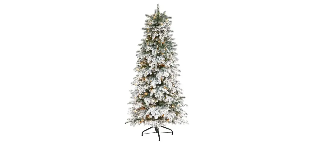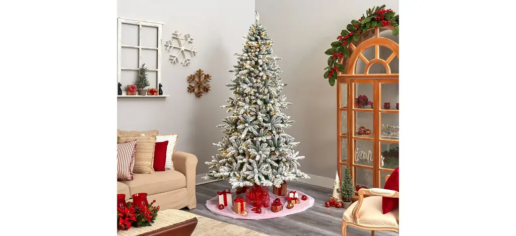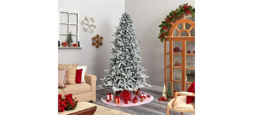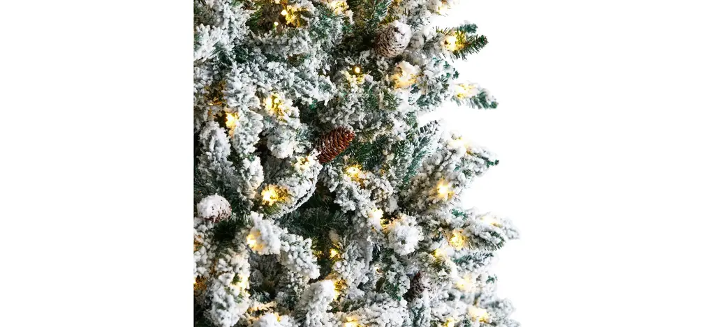 Transform your home into an enchanting winter wonderland with the 8' Flocked Livingston Fir Artificial Tree with Pine Cones . If you dream of a white Christmas, these artificial trees are designed to mimic the texture and foliage of real trees with their upward sloping branches that can easily house ornaments. Adorned with pine cones throughout.
