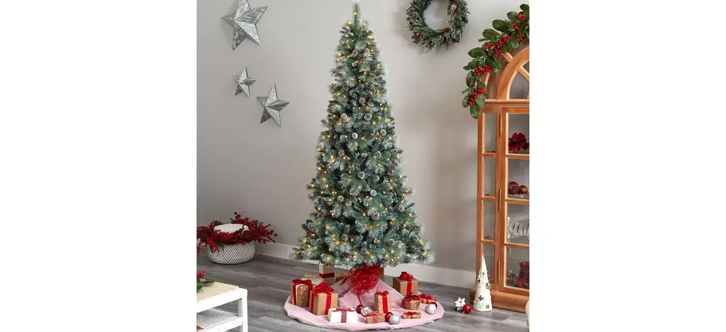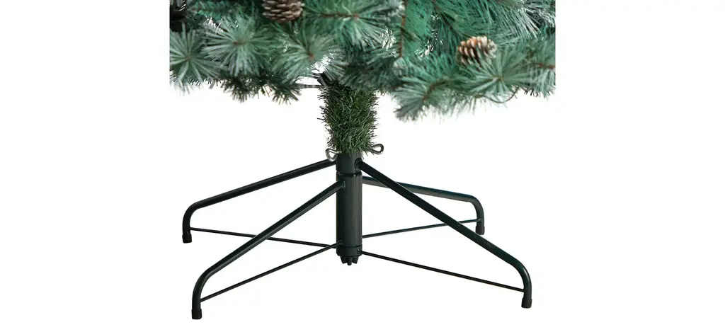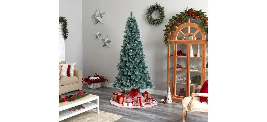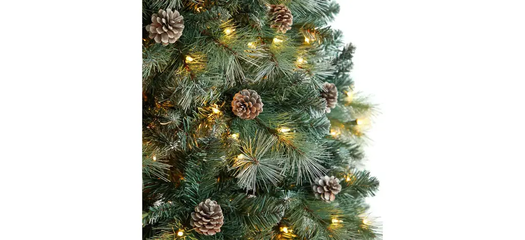 Bring the Canadian forest's rustic charm with the help of the 8' Frosted Tip British Columbia Mountain Pine Artificial Tree . A nod to nature, this realistic lifelike tree is accented with faux pinecones throughout and has the appearance of fresh, soft snow on the tips.