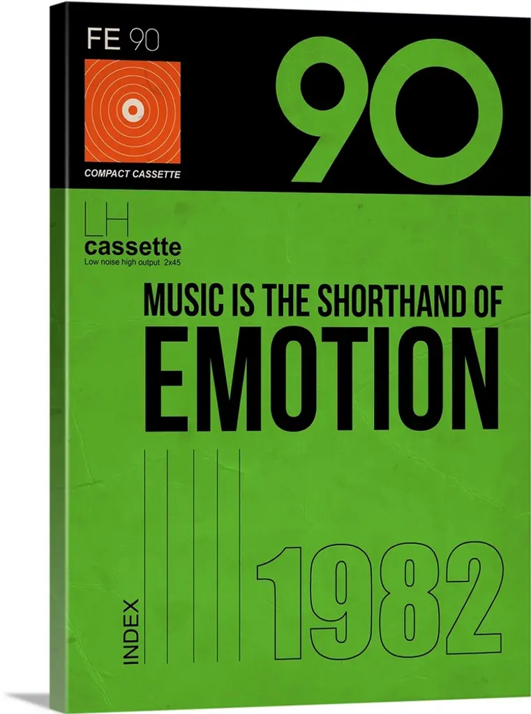 A retro graphic image featuring bold stripes of color and the silhouette of a tape cassette made to look like product packaging