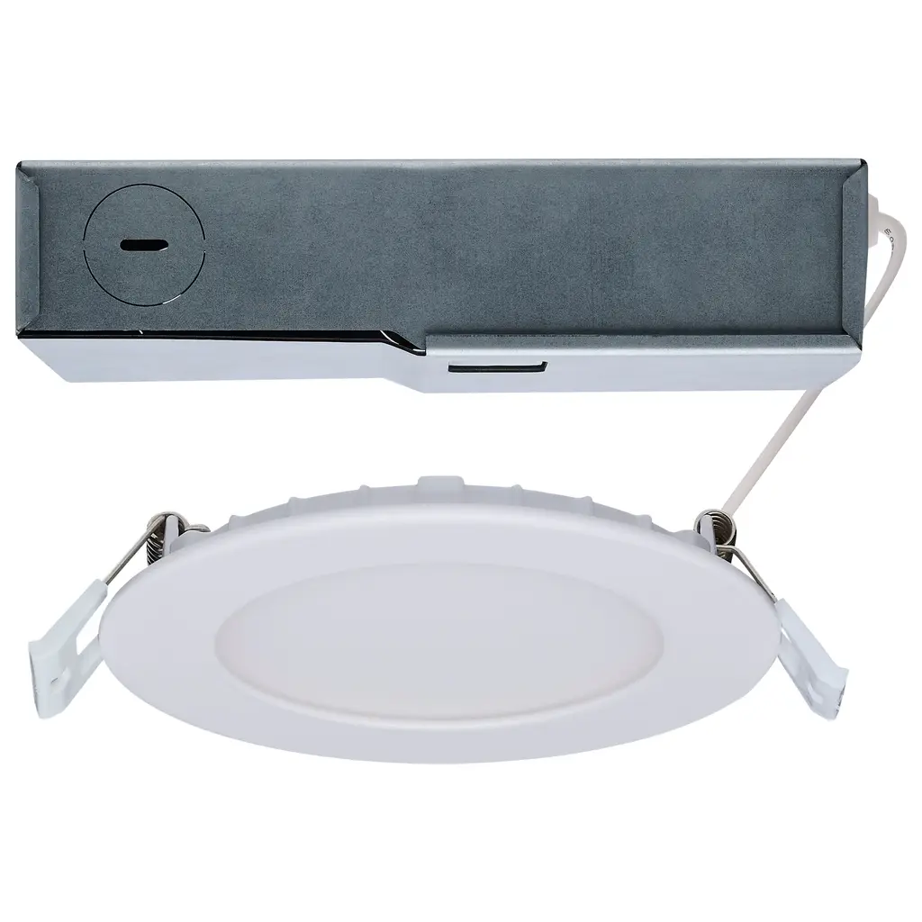 8/12 Watt LED Direct Wire Downlight - 27K/3K/35K/4K/5K CCT - Remote Driver - 4 Inch - Round - Flat Face - White Finish - 120-277 Volt - Dual Dimming. The SATCO NUVO Pro Series LED Slimfit Downlights offer exceptional versatility and performance. The S11690 4-inch round model features field-selectable five CCT and two wattage options (8W/12W), delivering both high output (HO) and very high output (VHO) illumination to suit various applications. Dual dimming capabilities, including Phase-cut dimming at 120V and 0-10V dimming at 120-277V, allow for precise lighting control. IC rated and Airtight rated, with a 90 CRI for superior color rendering, this downlight ensures long-lasting performance with a 50,000-hour lifespan and a 5-year warranty. Designed for ceilings with limited clearance, its slim profile and durable aluminum construction with an acrylic lens provide both functionality and style. With an NEC-compliant junction box and suitability for closet use, the S11690 is a practical and efficient lighting solution.