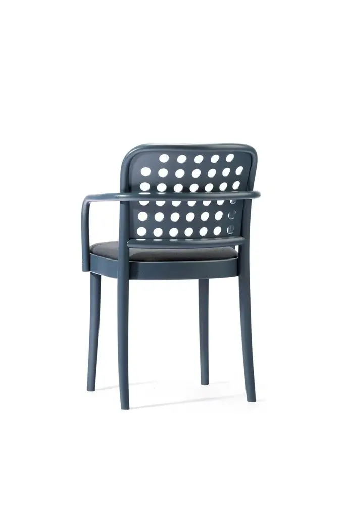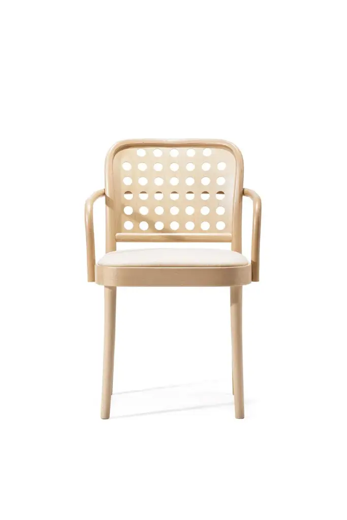 822 is a solid beech and veneer armchair with integrated cushion designed by Claesson Koivisto Rune for Ton.The 822 forms emulate Josef Hoffmann’s 1930 design of the modernist model 811. In its proportions, the 822 collection works more with the natural forms of manual bentwood technology; it tempers some parts of the structure, but conversely, the graphic use of circular holesvisually empowers the seat and backrest. These holes connect the colour finish with the interior the chair inhabits, or with the clothing of the person seated on it, and they impart a specific, timeless character to this comprehensive product family.WoodThe 822 collection combines the use of shaped plywood and manually bent solid wood. This specific technology only uses beechwood, which is naturally pale in colour and has a very soft texture. The products are made from wood certified by PEFC, a system focusing on responsible approaches to forest ecosystems and aiming to expand them.Colours and surface treatmentsNatural products can be finished with oil or lacquer to highlight the beechwood’s natural characteristics. Stains and pigment colours give the product a specific character and enable an interaction with the interior and the colours or styles worn by the person using it at any given time.