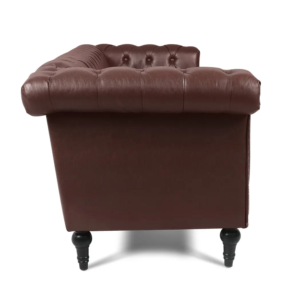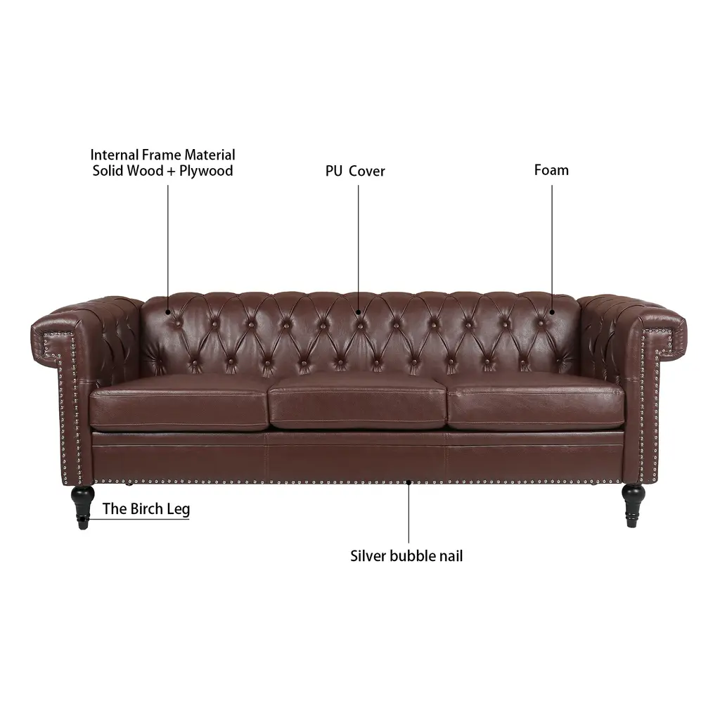 Genuine cotton high-density filling, comfortable to sit and high rebound rateSoft PU leather fabric, easy to cleanThe internal pine+laminated structure and gourd shaped birch leg shape have strong load-bearing capacityThe classic design with silver studs trim and solid wooden legs lends effortlessly chic appeal to any ensemble.Weights & Dimensions & DescriptionProduct Type:SofaProduct size:83.66 "W* 32.68"D * 29.53 "HSeat Length:66.93 "Seat Depth:22.44"Seat Hight:19.29"Cushion thickness:6.5"Leg Hight:6.69 "Distance from the Bottom of the sofa to the floor:6.69"Height of Backrest:12.2 "Width of Arm:8.86"Leg Material:BirchInternal Frame Material:Solid Wood + PlywoodInternal Seat Material:Pocket Springs with FoamInternal Backrest Material:FoamMaximum Load Bearing:660 LBSCarton Size:69.5 "W*24 "D*20.9 "HN.W.:92.60LBSG.W.:110.23LBSMaterial:PU Cover+ Foam +Wood Frame +Pocket Springs+Wood LegsAssembly Method:Seat/Arm/Back/Leg KD