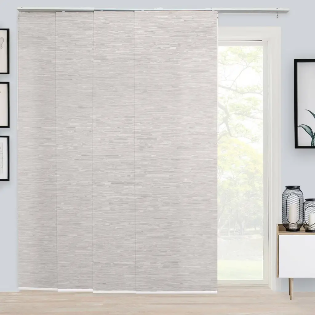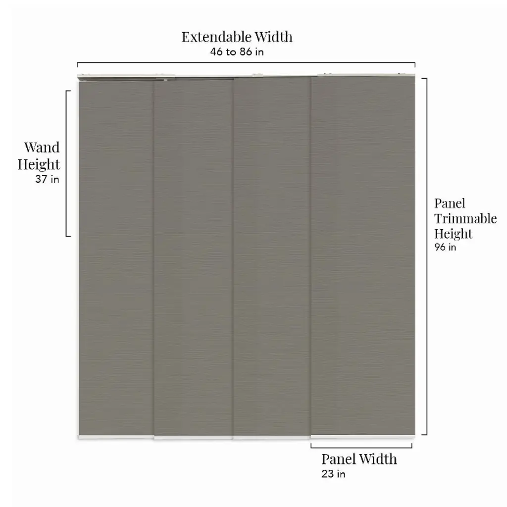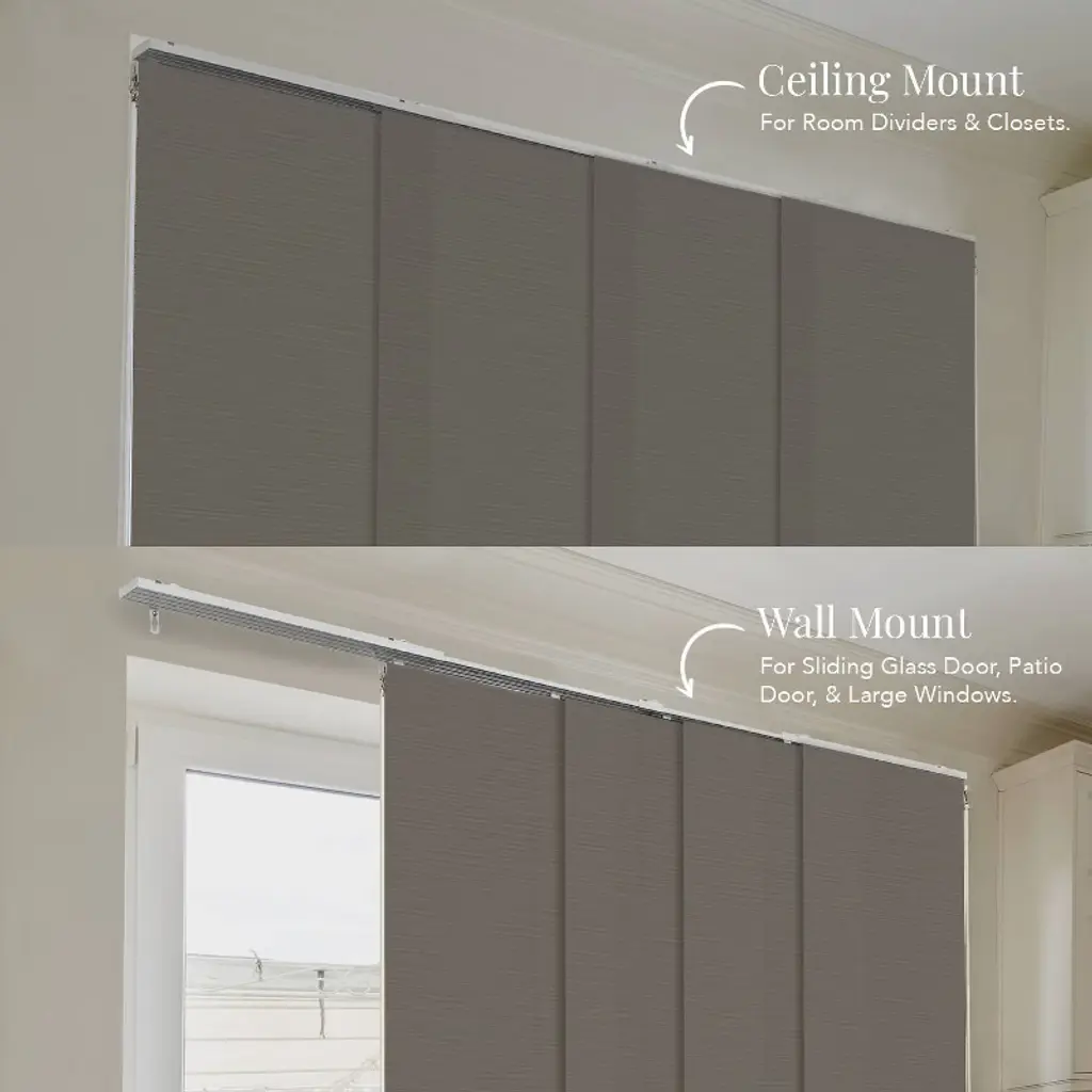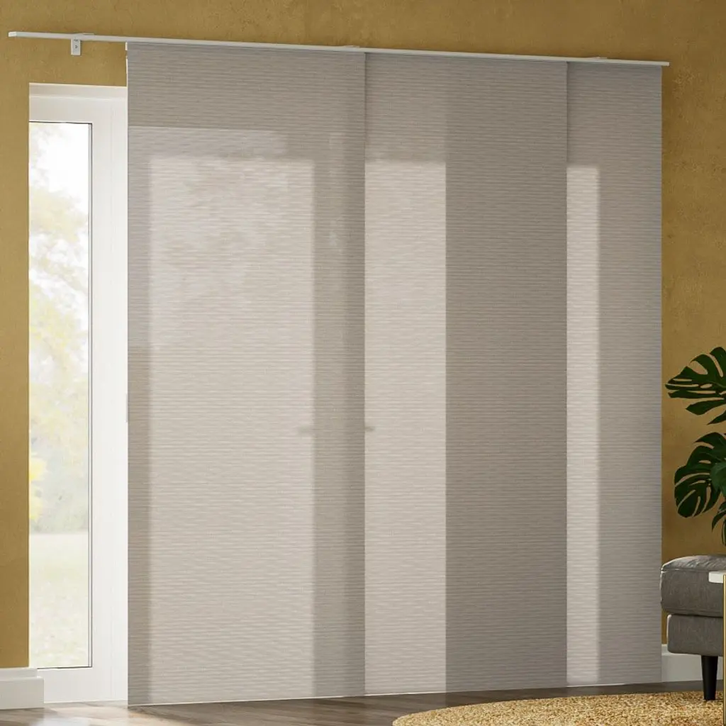 The Ballroom Adjustable Sliding Panels 4-Rail Track with Privacy Textured Fabric offers a stylish and functional solution for those seeking both privacy and light control. The textured fabric provides excellent privacy while gently filtering light, creating a cozy and comfortable atmosphere in any room. The adjustable 4-rail track, which spans from 46" to 86" wide, offers flexibility to fit a variety of window sizes, while the trimmable panels allow for a custom fit to your space. The panels glide effortlessly along the track using two wands, making it easy to open them to the left or right. With its sleek, modern design, this system enhances the aesthetic of your home and is ideal for large windows, sliding doors, or open spaces. Additionally, the cordless design ensures safety, making these blinds an excellent choice for homes with children or pets. The Ballroom Adjustable Sliding Panels combine privacy, convenience, and contemporary style for a functional, family-friendly window treatment.