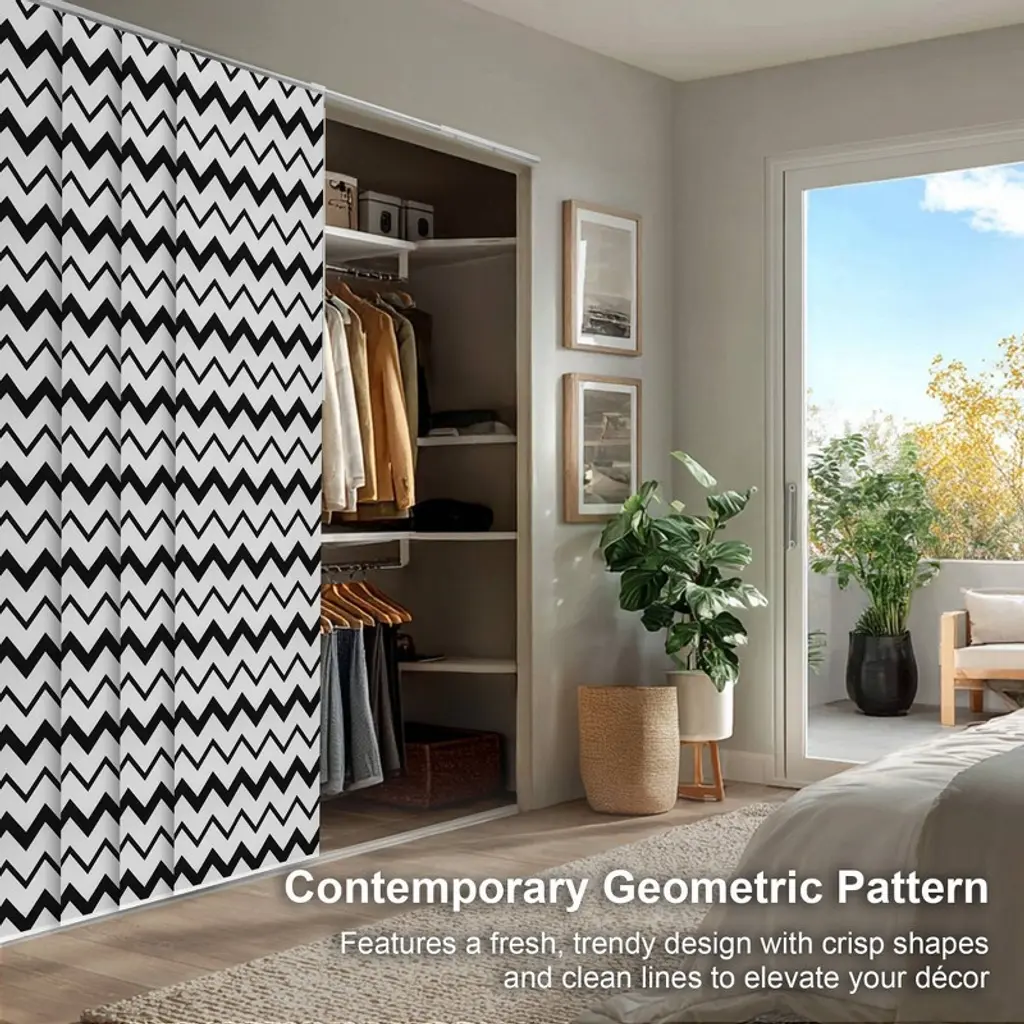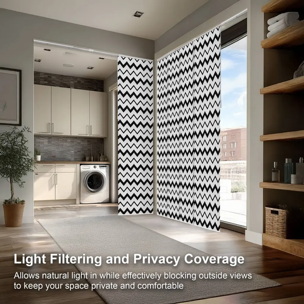 The GeoPrint Collection Panel Track Blinds offer a perfect combination of style and functionality for modern spaces. Featuring a sleek light-filtering fabric with a contemporary geometric print, these blinds create a sophisticated atmosphere while gently diffusing sunlight. The trimmable panels ensure a custom fit for any window or door, while the adjustable 4-rail track (from 46" to 86" wide) allows flexibility to accommodate various window sizes. With easy operation using two convenient wands, the panels can open to the left or right, depending on your preference. The cordless design ensures safety, making these blinds ideal for homes with children or pets. Plus, they can be mounted to either the ceiling or wall, offering versatility and a seamless look. Upgrade your home with the perfect blend of style, safety, and convenience with the GeoPrint Collection Panel Track Blinds.