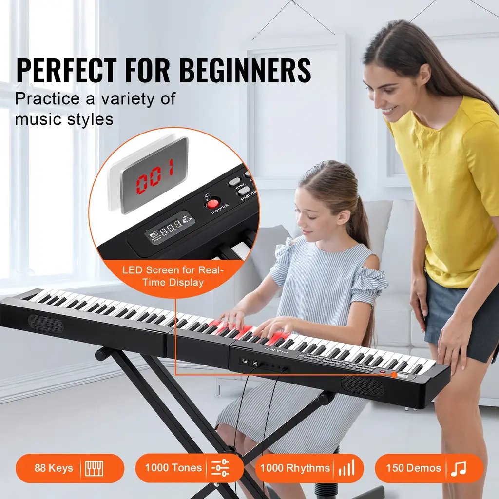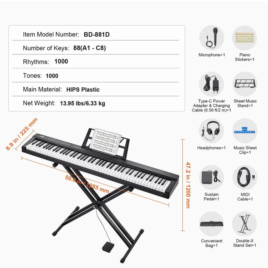 88-Key Digital Keyboard Piano: Discover the versatility of our 88-key semi-weighted keyboard piano, equipped with 1000 tones, 1000 rhythms, and 150 demo songs to inspire your musical creativity. The standard-sized keys, combined with included piano stickers, make it easier for beginners to master finger placement and practice effectively. 1000 Standard Tones, Easy Teaching: Unlock 1000 standard tones, 1000 international rhythms, and 150 demo songs with this electric keyboard piano. Explore a wide range of instrument sounds and musical styles, making it an excellent tool for teaching and discovering new genres. Ideal for both learning and creativity, it provides endless possibilities for musical exploration. Supports Bluetooth 5.0, USB & MIDI Connectivity: Equipped with a sustain pedal input, audio input, headphone jack, microphone input, USB port, and MIDI transmission, this digital keyboard piano offers seamless integration with computers, tablets, sustain pedals, and more. Enjoy versatile connectivity options to enhance your musical experience. Stereo Surround Sound for Every Note: Experience a rich, layered sound with built-in dual speakers that deliver true-to-life sound. We provide surround sound effect that accurately reproduces every note, ensuring clear pitch with distinct highs and lows for a fully immersive listening experience. Adjustable Double-X Stand, Ultimate Comfort: The ergonomic double-X stand ensures stability and can be adjusted from 11.8 to 38 in/30 to 96.5 cm to accommodate players of various ages and heights. Customize the height to suit your needs for optimal comfort and performance, ensuring you play your best every time. Package Content 1 x Sustain Pedal 1 x Sheet Music Stand 1 x Microphone 1 x Headphones 1 x Double-X Stand Set 1 x Convenient Bag