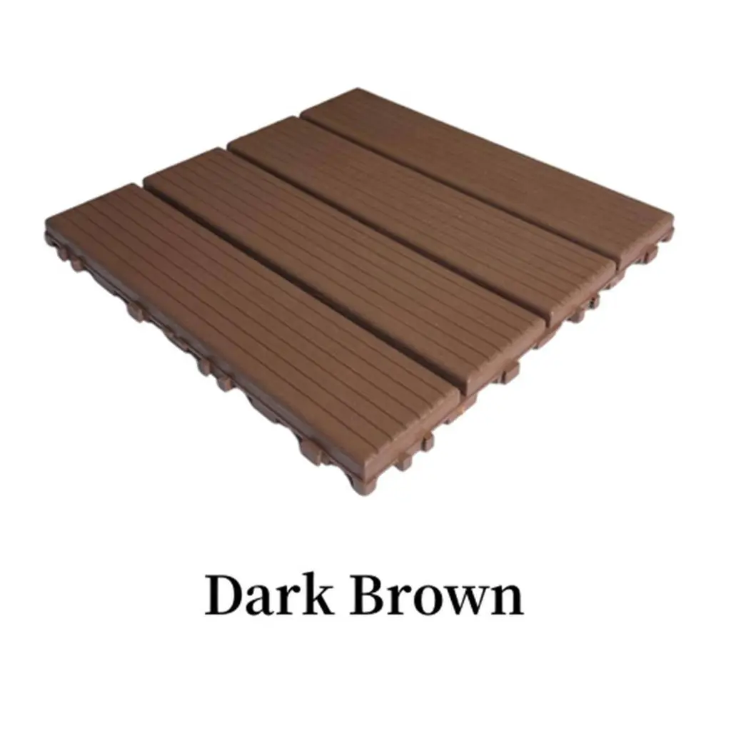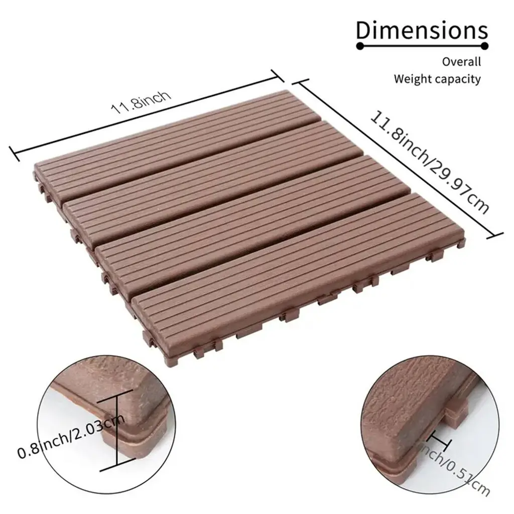 Specification: Key Features: Description: Transform your outdoor and indoor spaces with these 88pcs dark brown interlocking deck tiles, each measuring 11.8" x 11.8". Crafted from durable high-density plastic, these tiles offer exceptional resistance to corrosion, mold, and weather elements, ensuring long-lasting use. Their innovative four-way locking system makes installation quick and easy without tools, while the effective drainage design prevents water pooling and slip hazards. Perfect for patios, gardens, pool areas, or indoor flooring, these versatile tiles are customizable and simple to maintain, providing a durable, stylish solution for any space, all year round.