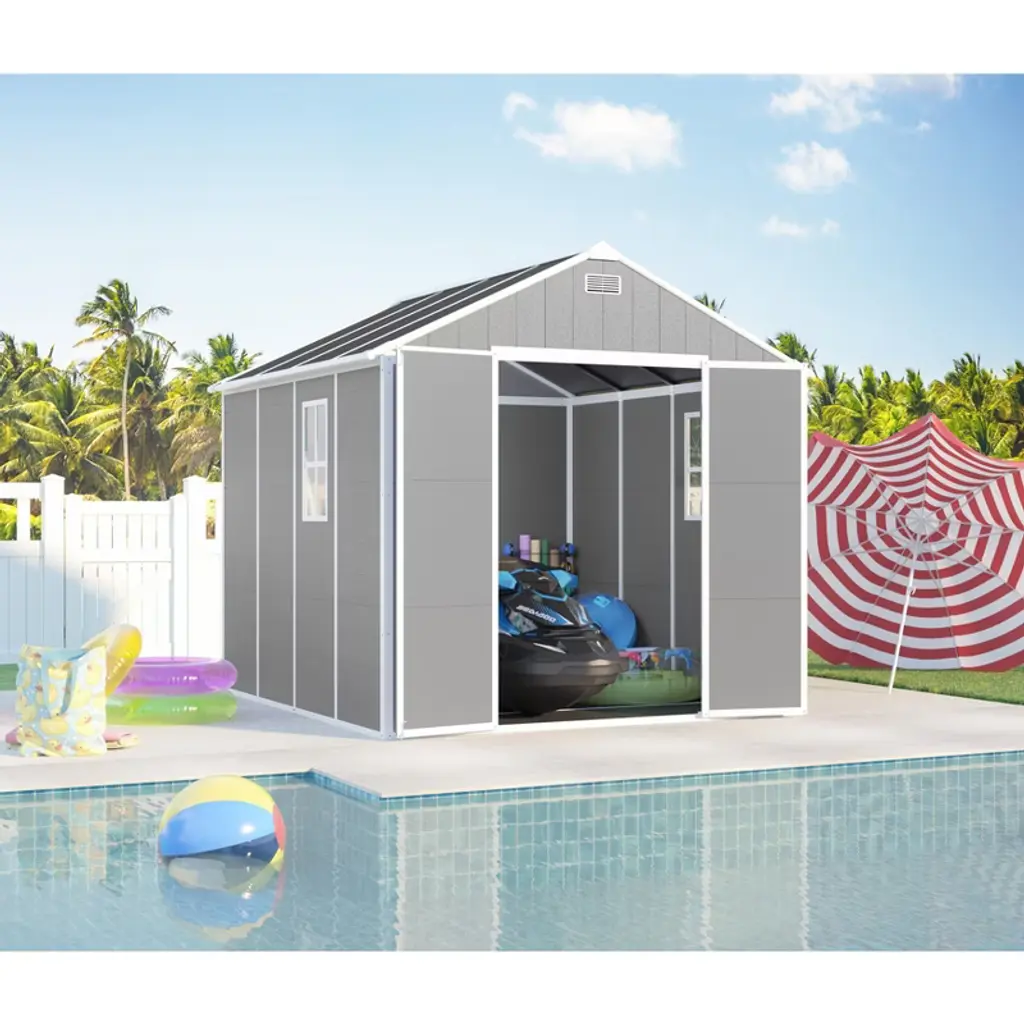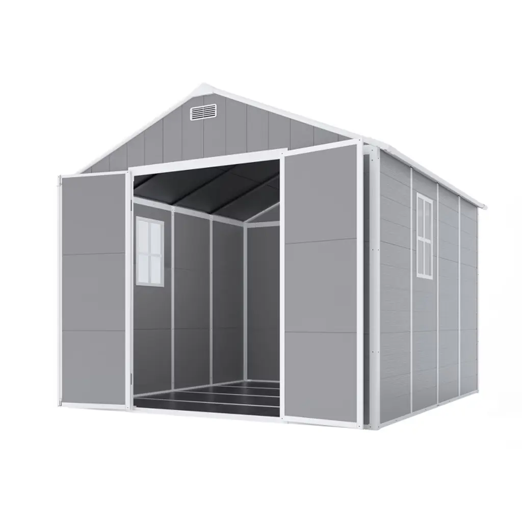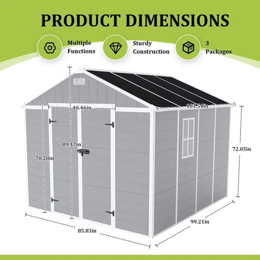 the space is spacious, the layout is free The large storage space is a highlight of this plastic room. Sufficient internal volume, can easily accommodate all kinds of furniture, equipment, materials, to meet your diverse storage needs. Whether as an outdoor studio, storing tools and materials; Or as a leisure holiday house, set beds, tables and chairs and other daily necessities; Or as a warehouse, store goods and debris, can be easily. Reasonable space layout can be freely planned according to your actual needs to create exclusive comfortable space, so that every inch of space can play the maximum value. the material is extraordinary, durable Selected high-quality PP material, its inherent toughness, laid a solid foundation for the plastic room. The thickness of 12 mm, far more than similar products, gives the house super pressure resistance and impact resistance, fear the invasion of wind and rain, but also can withstand the test of accidental collision. The solid structure design, carefully calculated and repeatedly tested, effectively disperses the force to ensure the overall stability, so that your living space is rock-solid and durable adapt to diverse environments Waterproof, rust-proof, and UV-proof properties make this plastic room an excellent companion for outdoor environments. Rain does not penetrate, and the house is always dry and cool; Metal parts never rust, appearance and performance is consistent; Effectively block UV rays, avoid aging and fading of interior and structure due to long-term exposure, extend service life, save maintenance costs for you, and let you enjoy outdoor life without worries Weights & Dimensions storage shed dimensions 8*8FT Color Gray Material polypropylene Product Dimensions W 99.21"*D85.82"*H88.58¡± Product door size W46.45"*H46.25¡± G.W 298.72lbs N.W 270.50lbs Style Backyard Garden Tool Shed Water Resistance Leve Waterproof Roof bearing 50kg per square Window material 1.5mm acrylic material Ultraviolet Light Protection Yes Assembly Required Yes