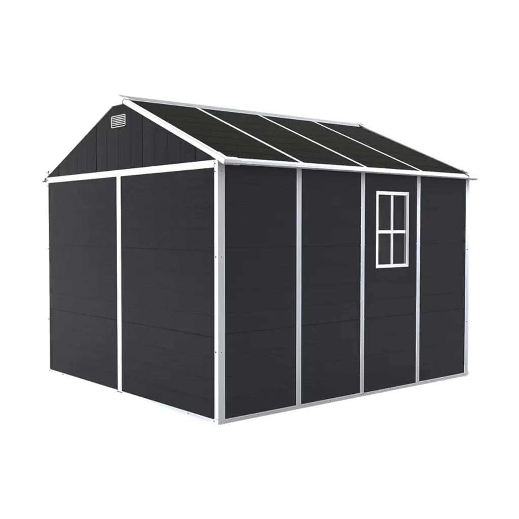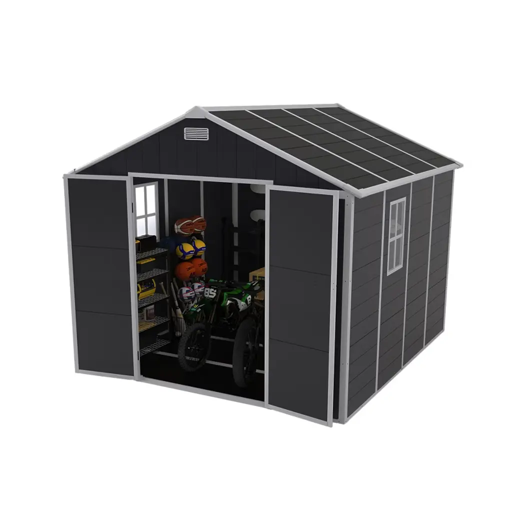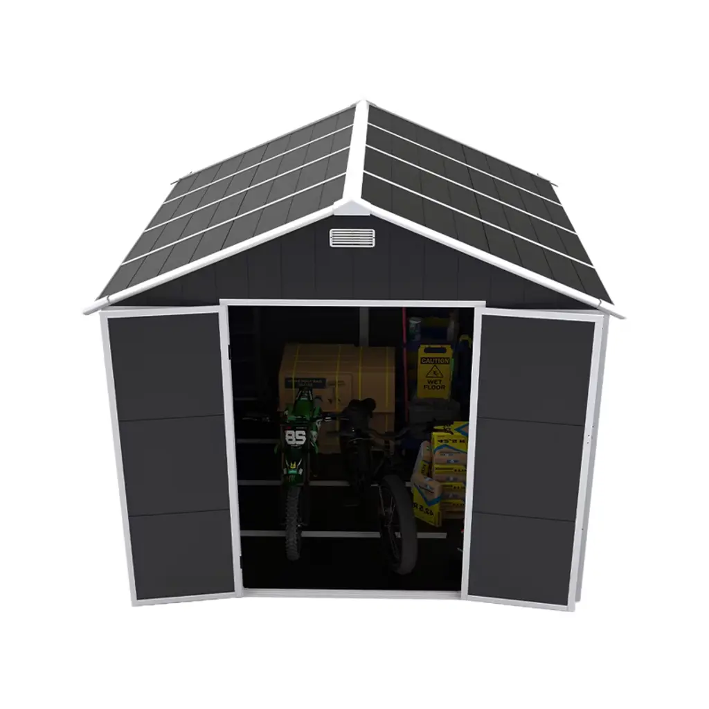 comprehensive protection Waterproof, rust-proof, and UV-proof properties make this plastic room an excellent companion for outdoor environments. Rain does not penetrate, and the house is always dry and cool; Metal parts never rust, appearance and performance is consistent; Effectively block UV rays, avoid aging and fading of interior and structure due to long-term exposure, extend service life, save maintenance costs for you, and let you enjoy outdoor life without worries. the space is spacious, the layout is free The large storage space is a highlight of this plastic room. Sufficient internal volume, can easily accommodate all kinds of furniture, equipment, materials, to meet your diverse storage needs. Whether as an outdoor studio, storing tools and materials; Or as a leisure holiday house, set beds, tables and chairs and other daily necessities; Or as a warehouse, store goods and debris, can be easily. Reasonable space layout can be freely planned according to your Weights & Dimensions storage shed dimensions 8*8FT Color Dark Gray Material polypropylene Product Dimensions W 99.21"*D85.82"*H88.58¡± Product door size W46.45"*H46.25¡± G.W 292.77lbs N.W 270.70lbs Style Backyard Garden Tool Shed Water Resistance Leve Waterproof Roof bearing 50kg per square Window material 1.5mm acrylic material Ultraviolet Light Protection Yes Assembly Required Yes