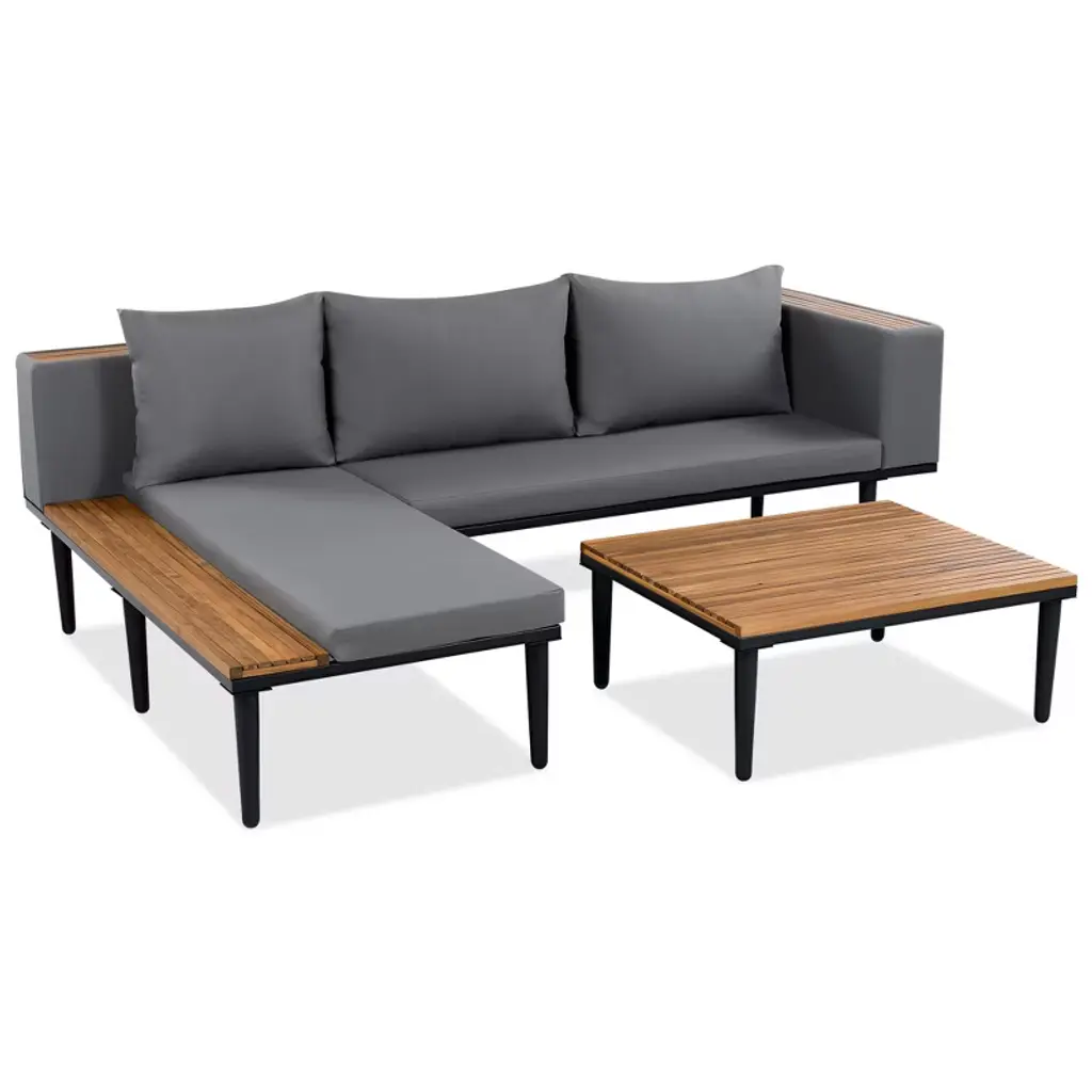 Enhance your outdoor living space with this beautifully designed patio sofa set that blends modern aesthetics with practical functionality. Perfect for patios, porches, balconies, backyards, decks, or poolside lounging, this set features sleek lines, thick cushions, and high-quality materials to deliver both comfort and style. Whether you're entertaining guests or relaxing with a book and drink in hand, this set offers a luxurious and convenient lounging experience. Product Features Stylish Sofas for Any Outdoor Setting: With its contemporary design and clean lines, this outdoor sofa set instantly upgrades your exterior space. The combination of a sleek seating arrangement, a practical coffee table, and a built-in acacia wood side table creates a cohesive and stylish lounge area perfect for entertaining or unwinding. Luxurious Comfort with Thick Cushions: The set features 3.15-inch thick seat cushions and three soft, plush backrest pillows, providing exceptional comfort and support. Upholstered in water-resistant and fade-resistant fabric, these cushions are built to withstand the elements and retain their quality season after season. Thoughtful Functional Details: The extended sofa includes an integrated acacia wood side table, offering additional surface space for drinks, books, or decorative accents. This convenient addition keeps everything you need within arm’s reach while enhancing the overall design of the set. Durable and Safe Construction: Crafted from solid acacia wood, known for its natural weather resistance, and supported by a strong iron frame, this set delivers lasting durability. Adjustable non-slip feet provide balance on uneven surfaces, while thickened legs increase stability and safety for all users. Quick Assembly and Low Maintenance: This set ships in two boxes and includes all necessary tools and easy-to-follow instructions for a hassle-free assembly process. Maintenance is simple — just wipe with a damp cloth and mild cleaner to keep it looking its best. Specifications Weight Capacity: Table – 120 lbs; Sofa – 396 lbs per seat Net Weight: 113.54 lbs Material: Acacia Wood + Iron + Polyester Assembly Time: Approximately 1 hour