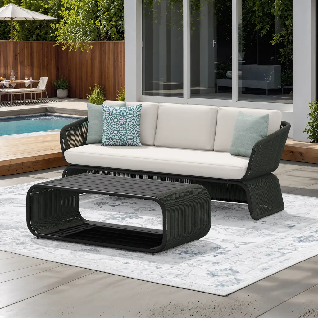 Enhance your outdoor living space with this beautifully designed patio sofa set that blends modern aesthetics with practical functionality. Perfect for patios, porches, balconies, backyards, decks, or poolside lounging, this set features sleek lines, thick cushions, and high-quality materials to deliver both comfort and style. Whether you're entertaining guests or relaxing with a book and drink in hand, this set offers a luxurious and convenient lounging experience. Product Features Stylish Sofas for Any Outdoor Setting: With its contemporary design and clean lines, this outdoor sofa set instantly upgrades your exterior space. The combination of a sleek seating arrangement, a practical coffee table, and a built-in acacia wood side table creates a cohesive and stylish lounge area perfect for entertaining or unwinding. Luxurious Comfort with Thick Cushions: The set features 3.15-inch thick seat cushions and three soft, plush backrest pillows, providing exceptional comfort and support. Upholstered in water-resistant and fade-resistant fabric, these cushions are built to withstand the elements and retain their quality season after season. Thoughtful Functional Details: The extended sofa includes an integrated acacia wood side table, offering additional surface space for drinks, books, or decorative accents. This convenient addition keeps everything you need within arm’s reach while enhancing the overall design of the set. Durable and Safe Construction: Crafted from solid acacia wood, known for its natural weather resistance, and supported by a strong iron frame, this set delivers lasting durability. Adjustable non-slip feet provide balance on uneven surfaces, while thickened legs increase stability and safety for all users. Quick Assembly and Low Maintenance: This set ships in two boxes and includes all necessary tools and easy-to-follow instructions for a hassle-free assembly process. Maintenance is simple — just wipe with a damp cloth and mild cleaner to keep it looking its best. Specifications Weight Capacity: Table – 120 lbs; Sofa – 396 lbs per seat Net Weight: 113.54 lbs Material: Acacia Wood + Iron + Polyester Assembly Time: Approximately 1 hour