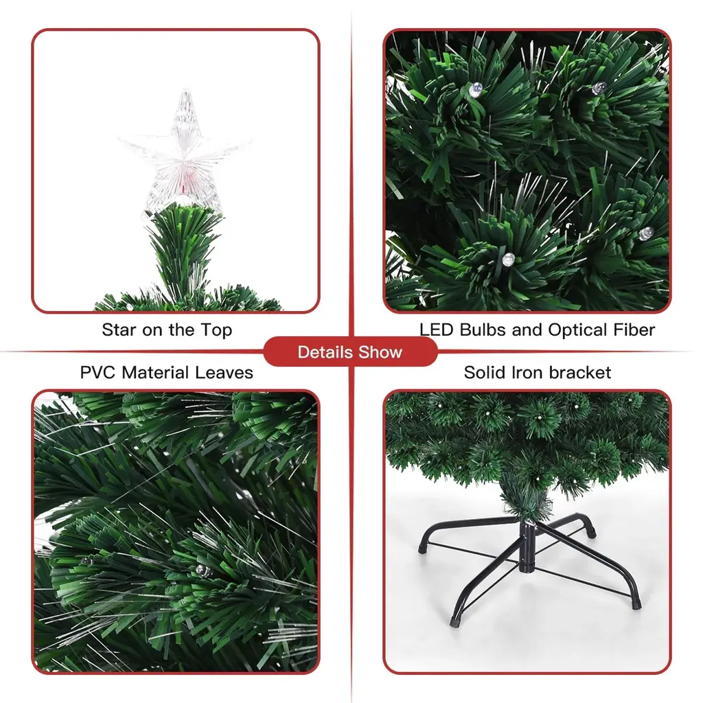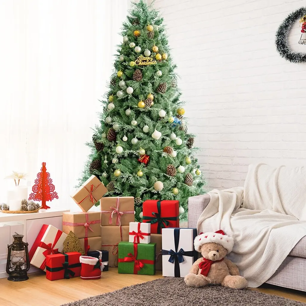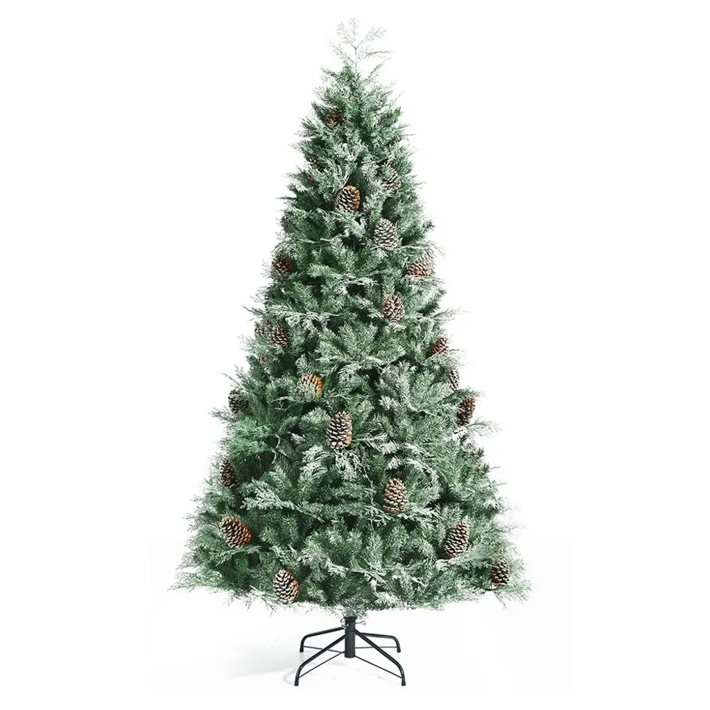 ▌ PRODUCT DETAILS: Description: This is our 8 feet unlit Christmas tree designed for indoor festival and holiday decoration. With 1282 PVC branch tips and 369 PE branch tips, the tree has a lush and full appearance. Several classic pine cones are decorated on the tree to make it as natural as a real tree. This frosty artificial tree allows you to decorate it according to your preferences. Buy extra ornaments and DIY your dreamed tree to match various party themes or festivals! Meanwhile, the relationship between you and your family will be deepened through the interactions. Made of 100% new PVC and PE, the tree is odorless, non-toxic and recyclable for daily use. Add this tree to warm up your room atmosphere! Features: Easy assembly and disassembly with three premium sections Hinged branch tips can be expanded easily in a short time Glitter branches with snowy pine cones giving you a snowy and sparkling look Crafted with 1282 PVC tips and 369 PE tips for a dense appearance New materials are odorless, flame-retardant and non-toxic for daily use Ideal for indoor, holiday and festival decoration Specifications: Color: Green Material: New PVC, New PE, Metal Overall Dimensions: 8FT X 4.8FT Net Weight: 38 lbs Number of PVC Tips: 1282 Number of PE Tips: 369 Number of Sections:3 Package includes: 1 X Snow Flocked Christmas Tree 1 X Metal Stand