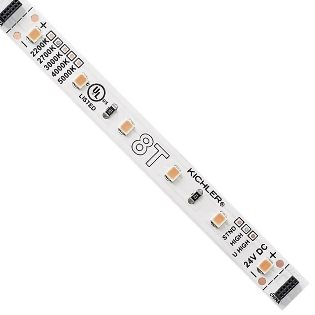 Roll out a defining glow against your architectural features with the generously sized 8T 33' High Output LED Tape Light from Kichler. The piece is designed to be flexible and efficient in its ease of installation. It provides peace of mind as it mounts with an edge-to-edge adhesive. Cut marks on the front and back help provide clean and precise sizing. To match the double-sided marks, the tape light offers a multi-directional connector. A double layer of copper flows to each end, reducing voltage drops even at a great length. Evenly spaced, the brilliant LEDs turn on to produce a neat linear glow.