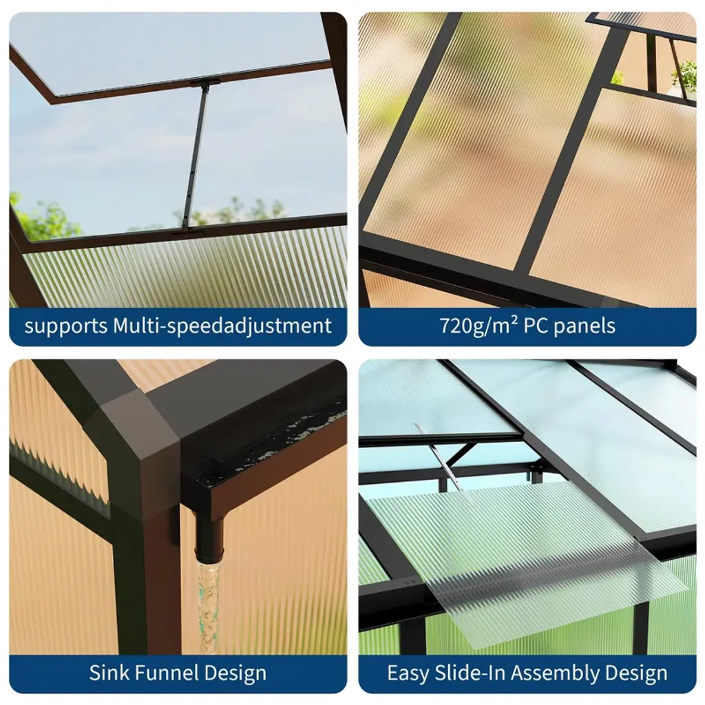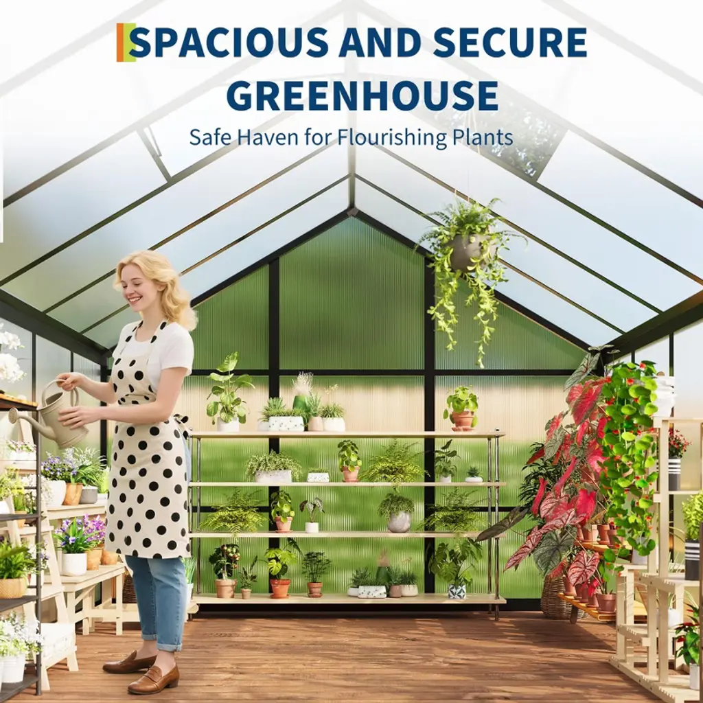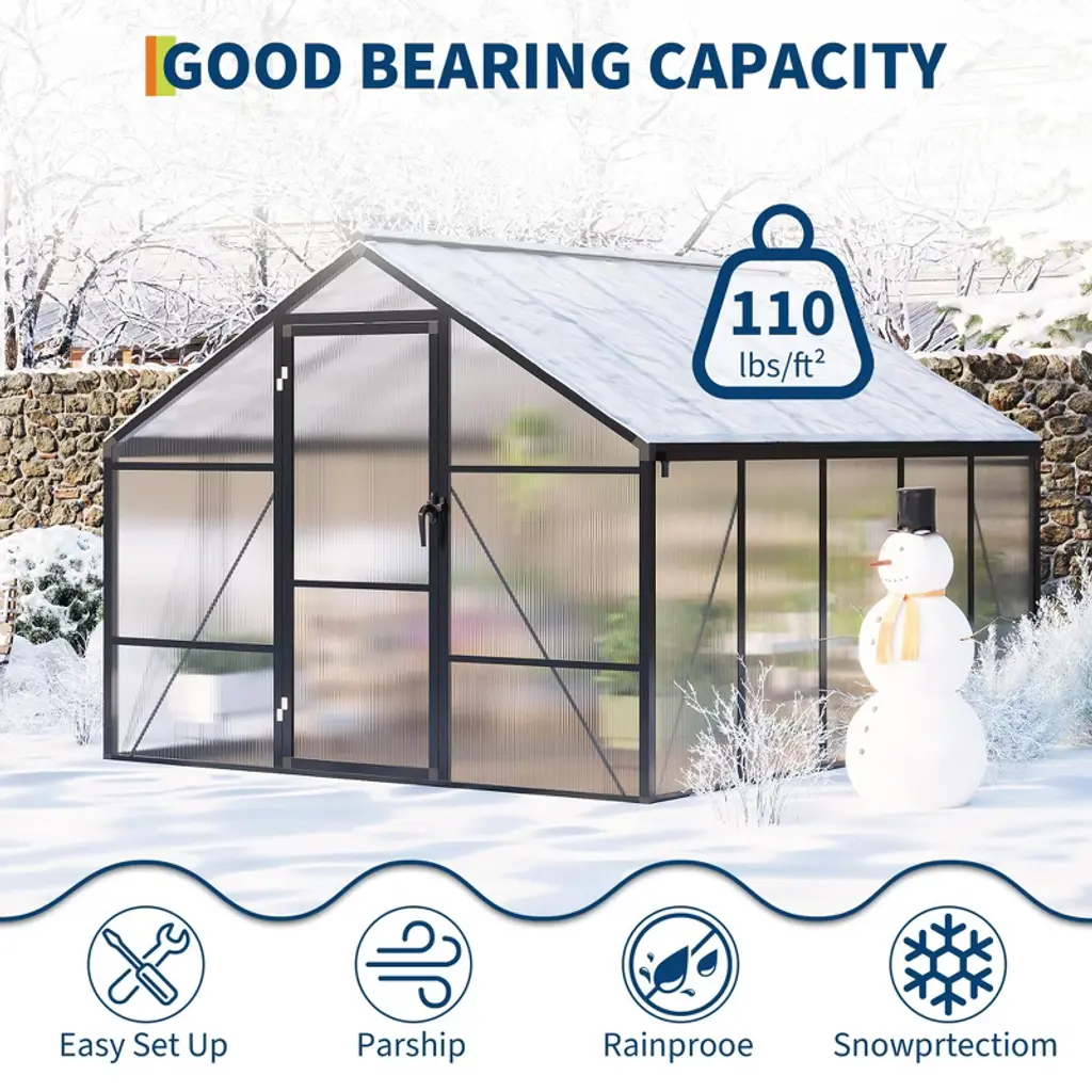 8X10 Ft Aluminum Large Walk-in Green House Polycarbonate Greenhouse With Roof Vent Ground Nails Lockable Push Door Black
