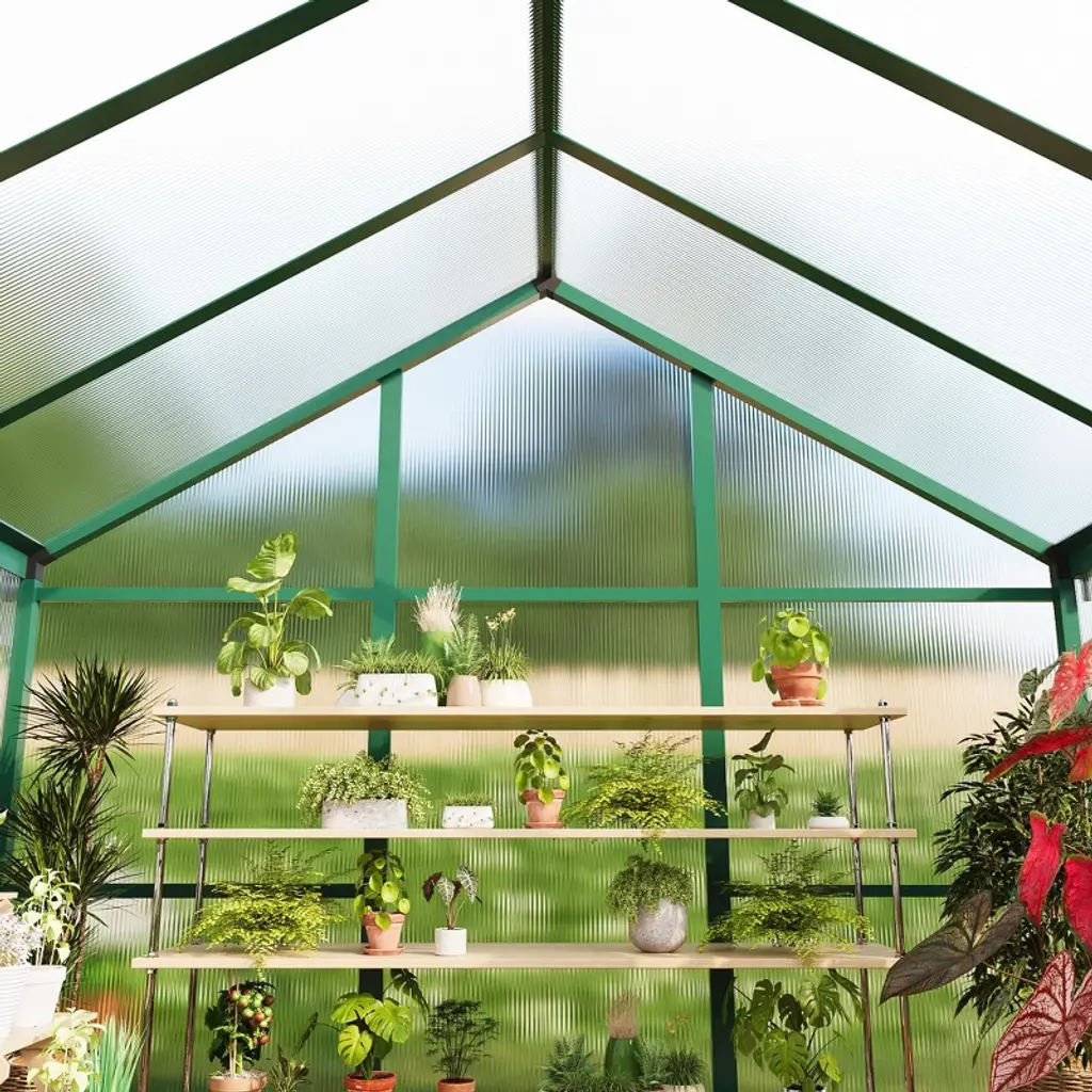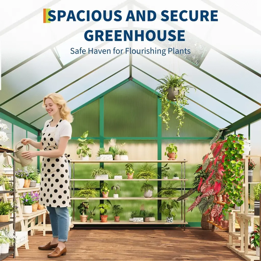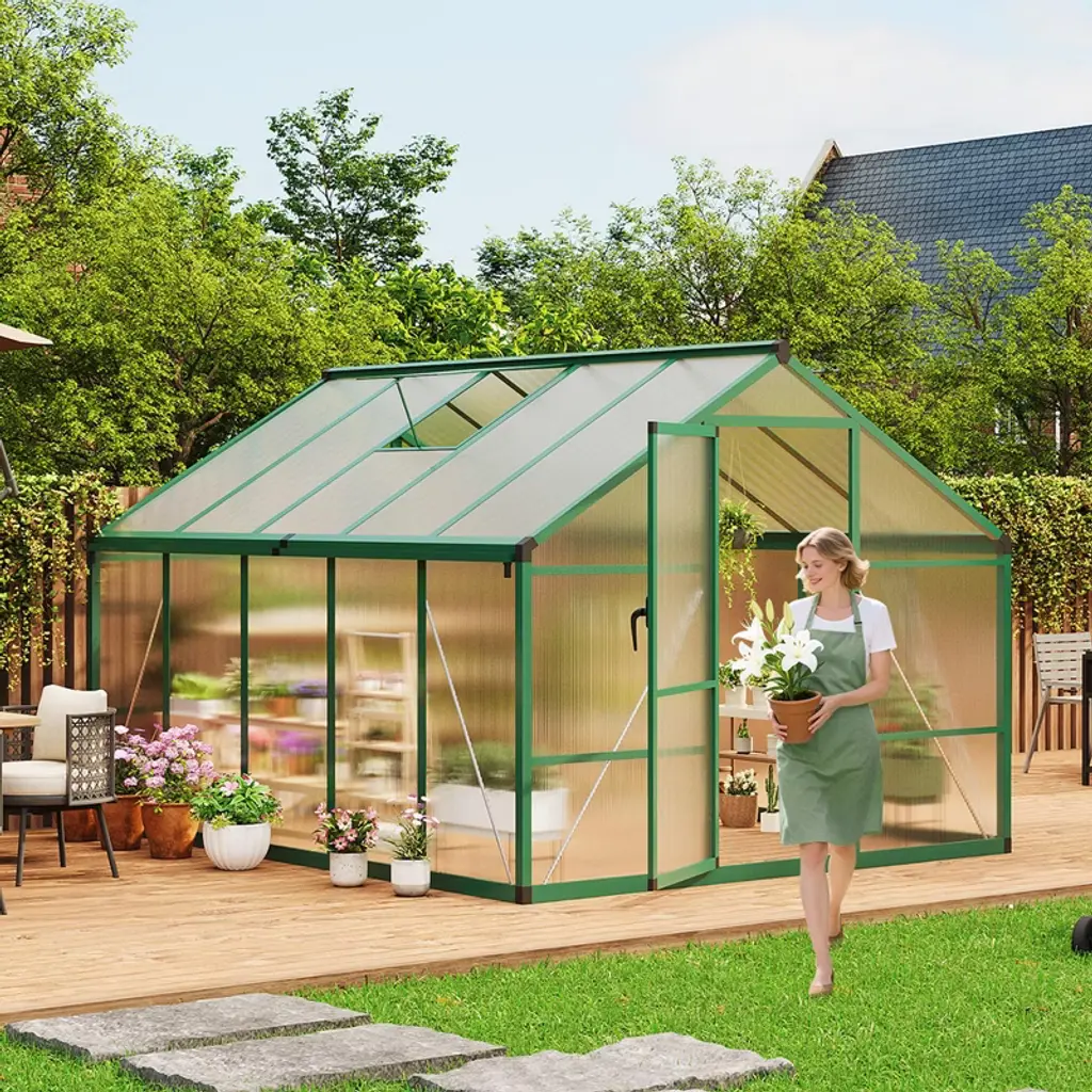 8X10 Ft Aluminum Large Walk-in Green House Polycarbonate Greenhouse With Roof Vent Ground Nails Lockable Push Door Green