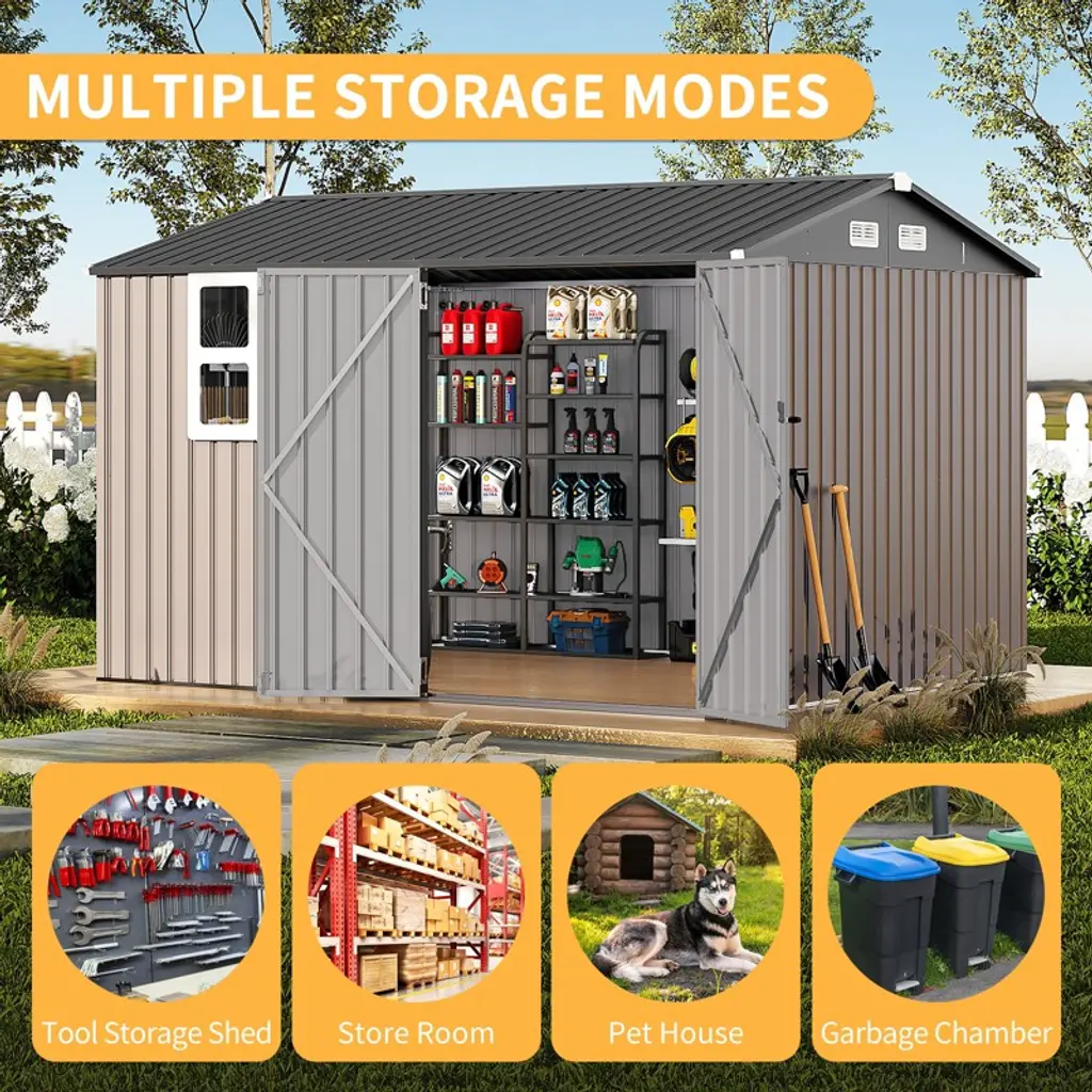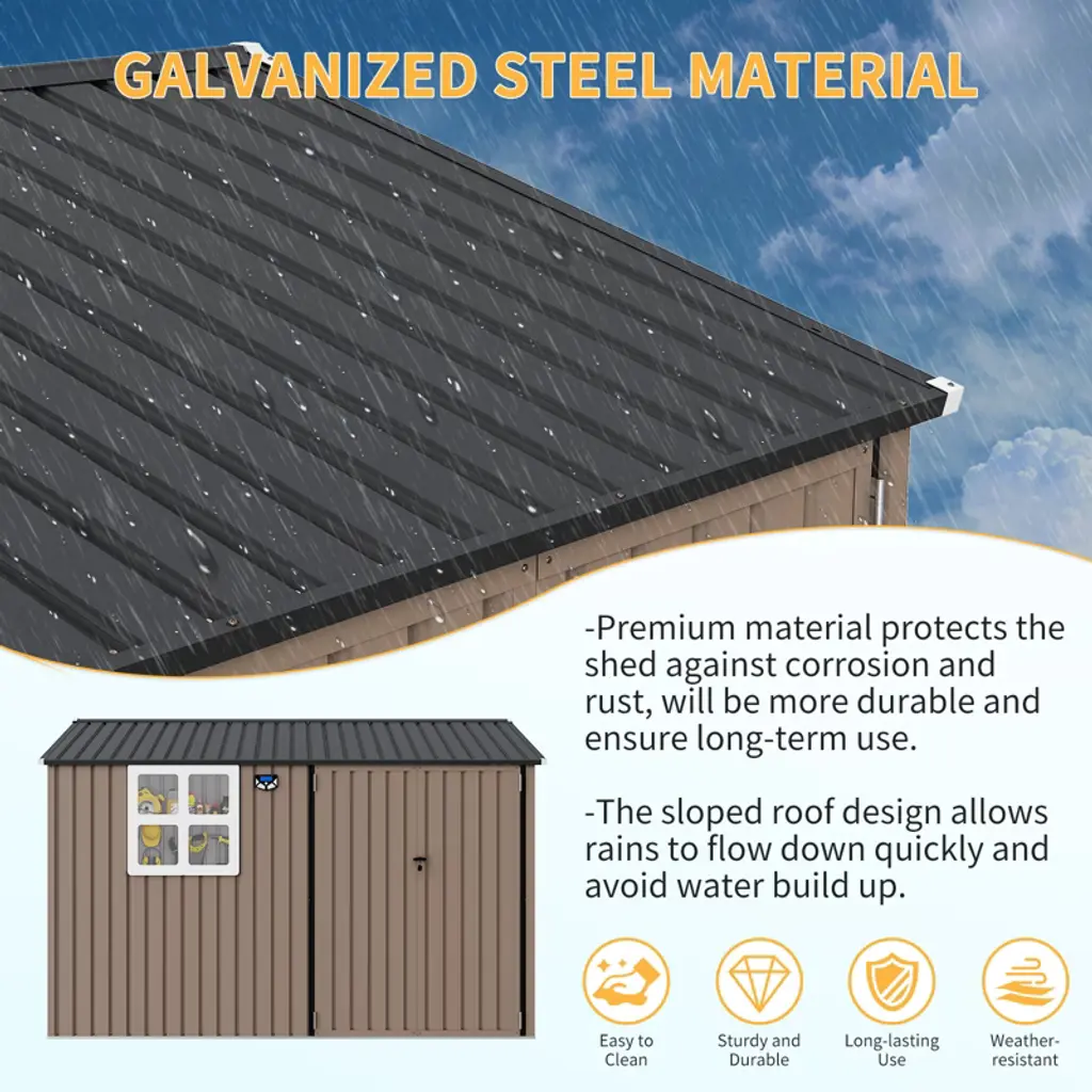 Keep your backyard neat, organized, and protected with this durable and spacious outdoor storage shed. Made from heavy-duty galvanized steel, it’s built to withstand rain, wind, snow, and harsh sun without rusting or fading. The shed features a water-shedding sloped roof, wide double doors with a secure lock, built-in air vents for ventilation, and clear windows that let in natural light—making it easier to find your tools and gear.Whether you're storing gardening tools, lawn equipment, bicycles, or seasonal décor, this shed offers the perfect solution with generous interior space and a sturdy structure designed for long-lasting use. No floor is included, giving you the flexibility to build your own base to suit your needs.Highlights:Heavy-duty galvanized steel for year-round weather protectionClear windows for visibility and natural lightBuilt-in vents promote airflow and reduce humidity buildupSloped roof prevents water pooling