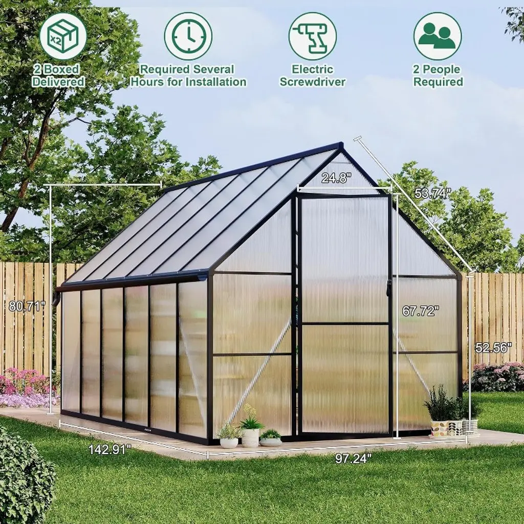8X12ft Aluminum Greenhouse Kit With Polycarbonate Panels - Quick Setup, Adjustable Roof Vent & Weather-resistant Design