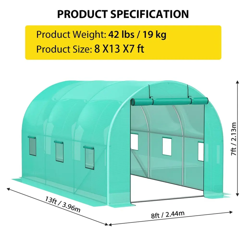 8X13x7ft Walk-in Greenhouse, Galvanized Steel Frame (19x0.6 Pipes) With 6 Mesh Windows & Full Zipper Door