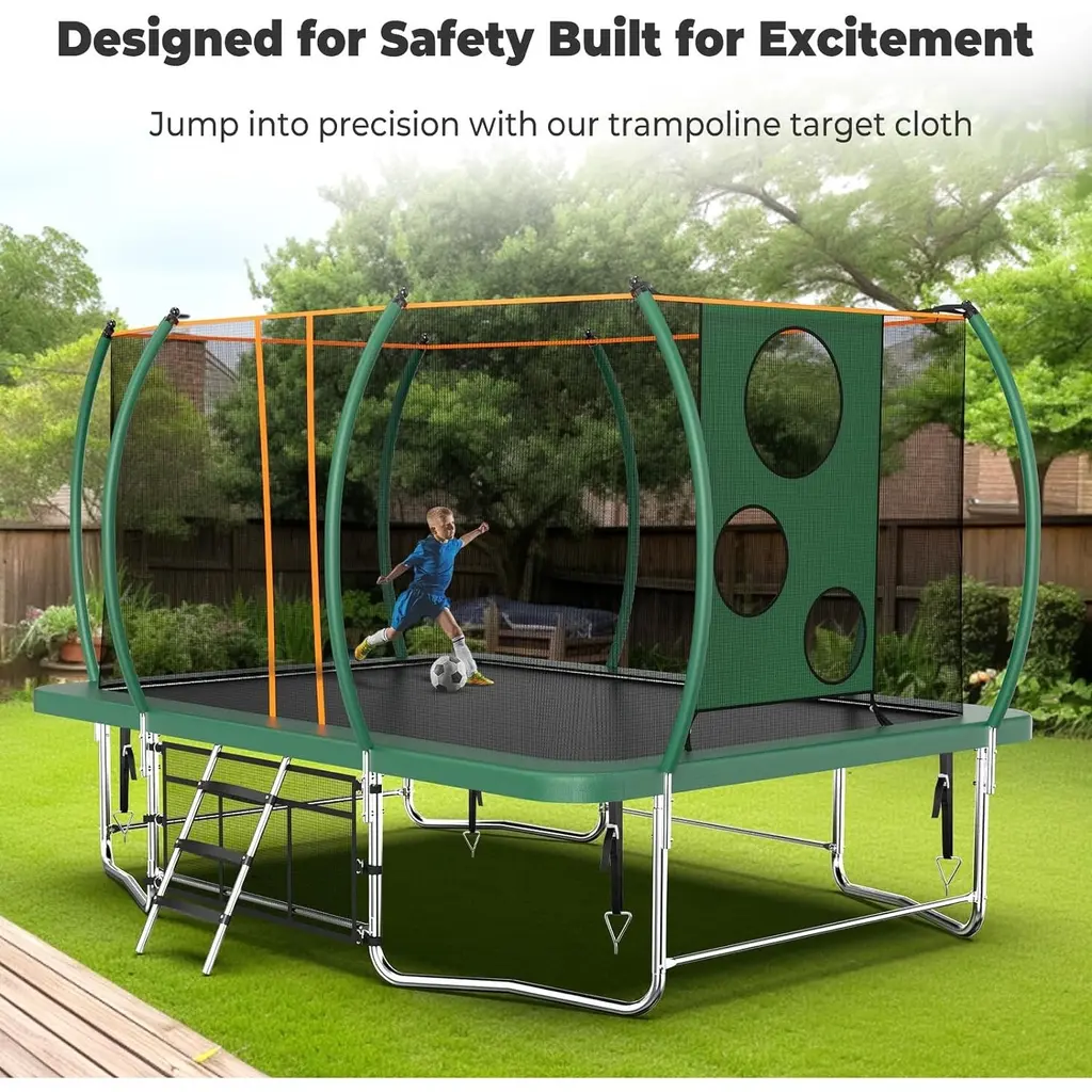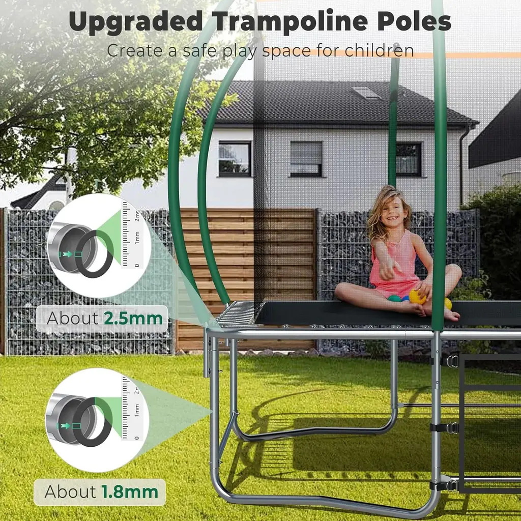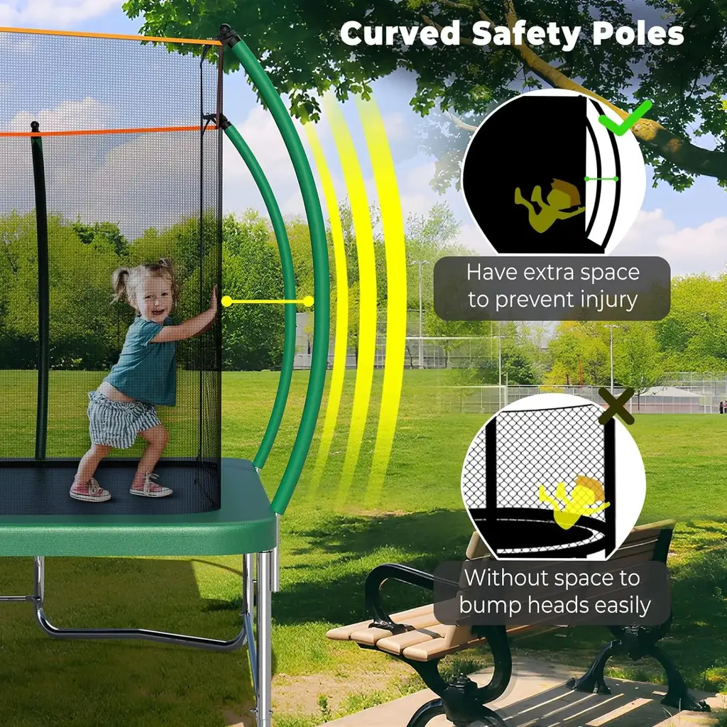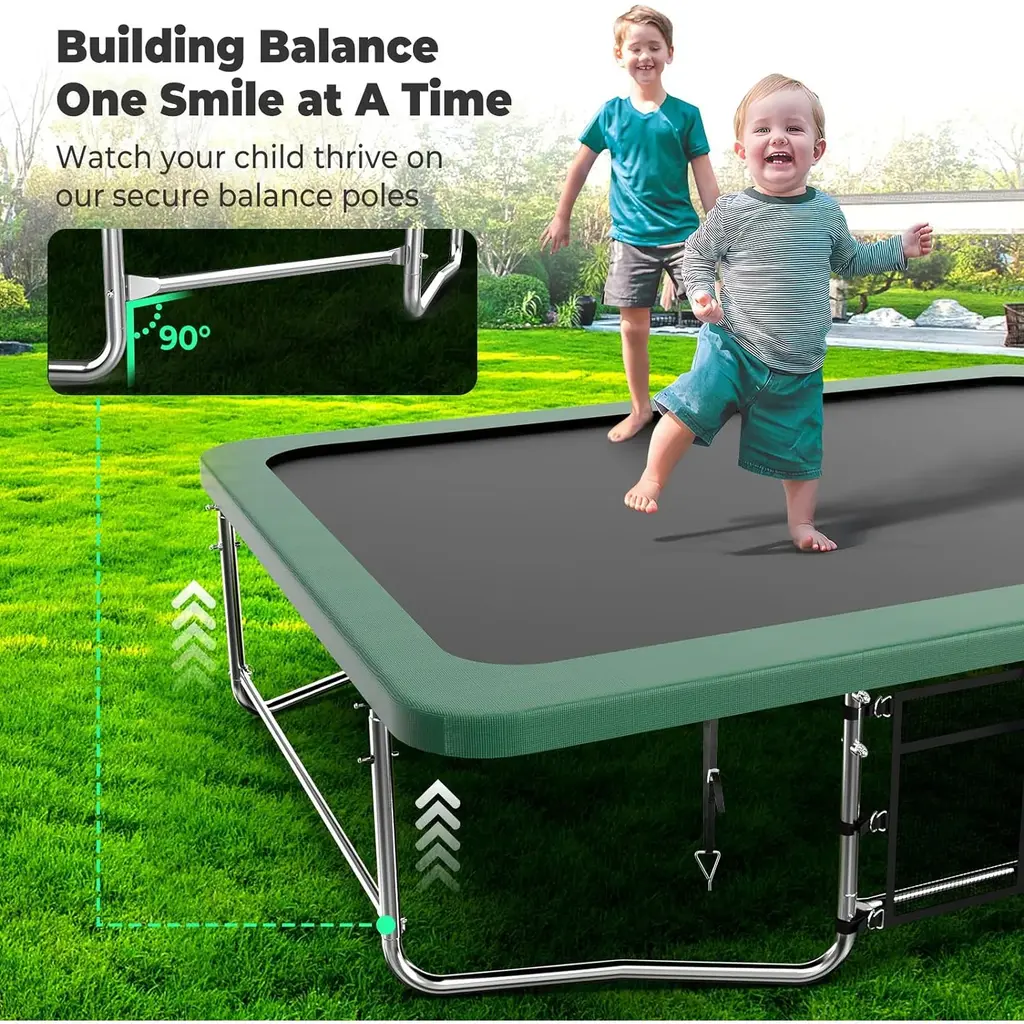 【Exceptional Bounce and Spacious Jumping Area】Rectangular trampoline for both kids and adults delivers an unparalleled bounce and generous free-jumping space, surpassing the capabilities of round trampolines. Experience consistent, even bouncing regardless of your landing spot, enabling a wide range of acrobatic moves such as front flips, back flips, and twists. Each jump combines safety with exhilarating fun.【Perfect for Emerging Athletes】Tailored for children with athletic aspirations, our rectangular trampoline serves as an ideal training ground for future gymnasts and trampoline enthusiasts. Foster their talents and ignite a passion for athletic excellence from an early age.【Space-Efficient Design】Our backyard trampoline features a compact footprint, making it ideal for yards and narrow spaces. It optimally utilizes available areas, ensuring that you can revel in bouncing fun even in limited spaces.【Robust Spring System for Longevity】Engineered for durability, the outdoor trampoline's spring system operates independently based on your position on the trampoline surface. This reduces strain and extends the overall lifespan of the trampoline, ensuring that your investment provides enduring enjoyment.【Family-Friendly and Secure】With ample space and a consistent bounce, our square trampoline with a safety net is suitable for multiple users, allowing both kids and adults to partake in active playtime together. It serves as an excellent avenue for promoting family bonding and outdoor activities while minimizing screen time.