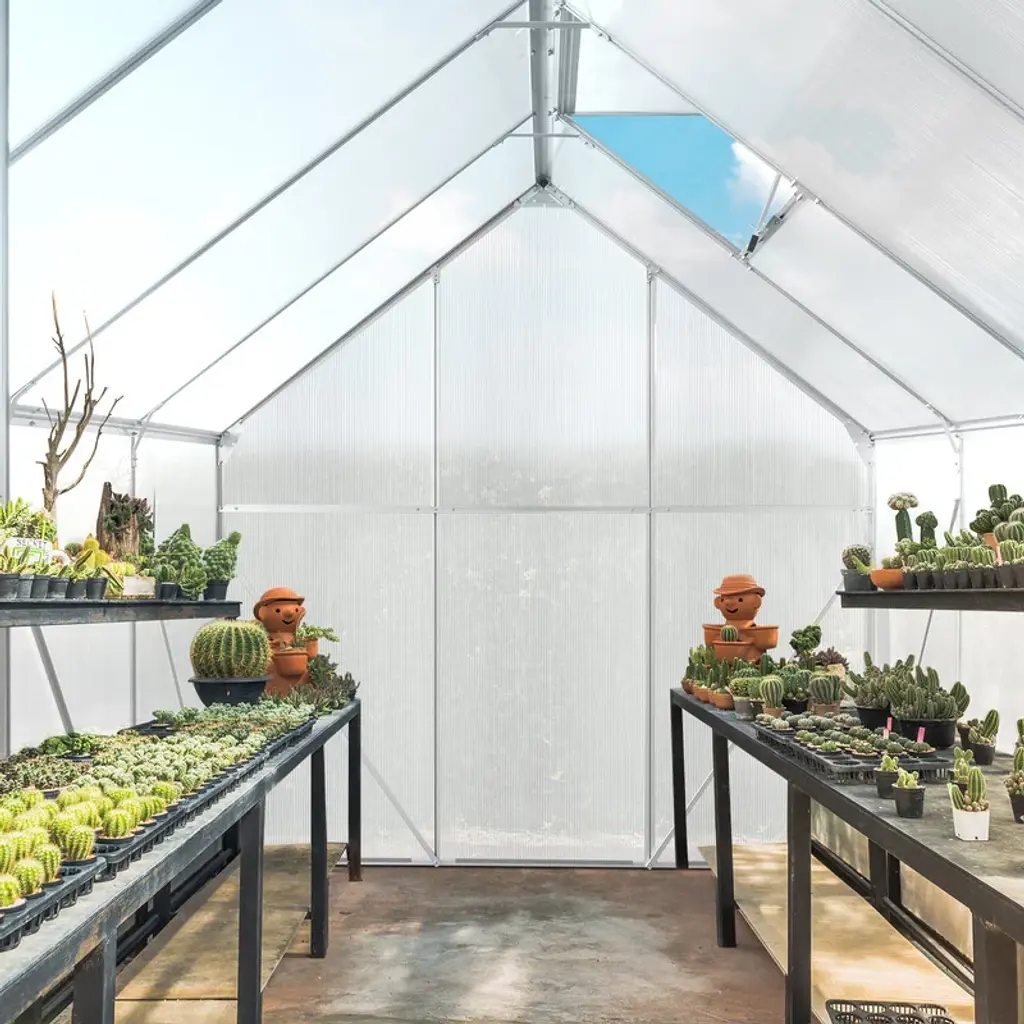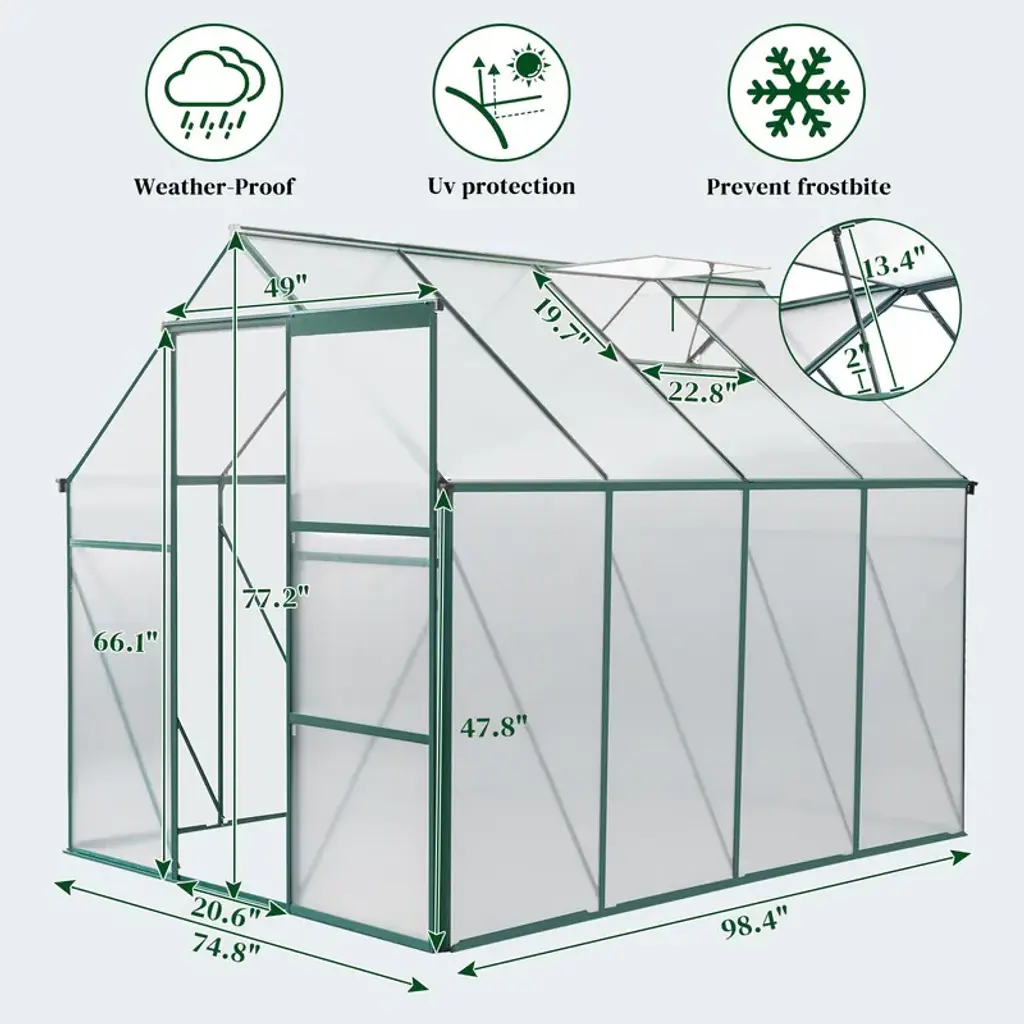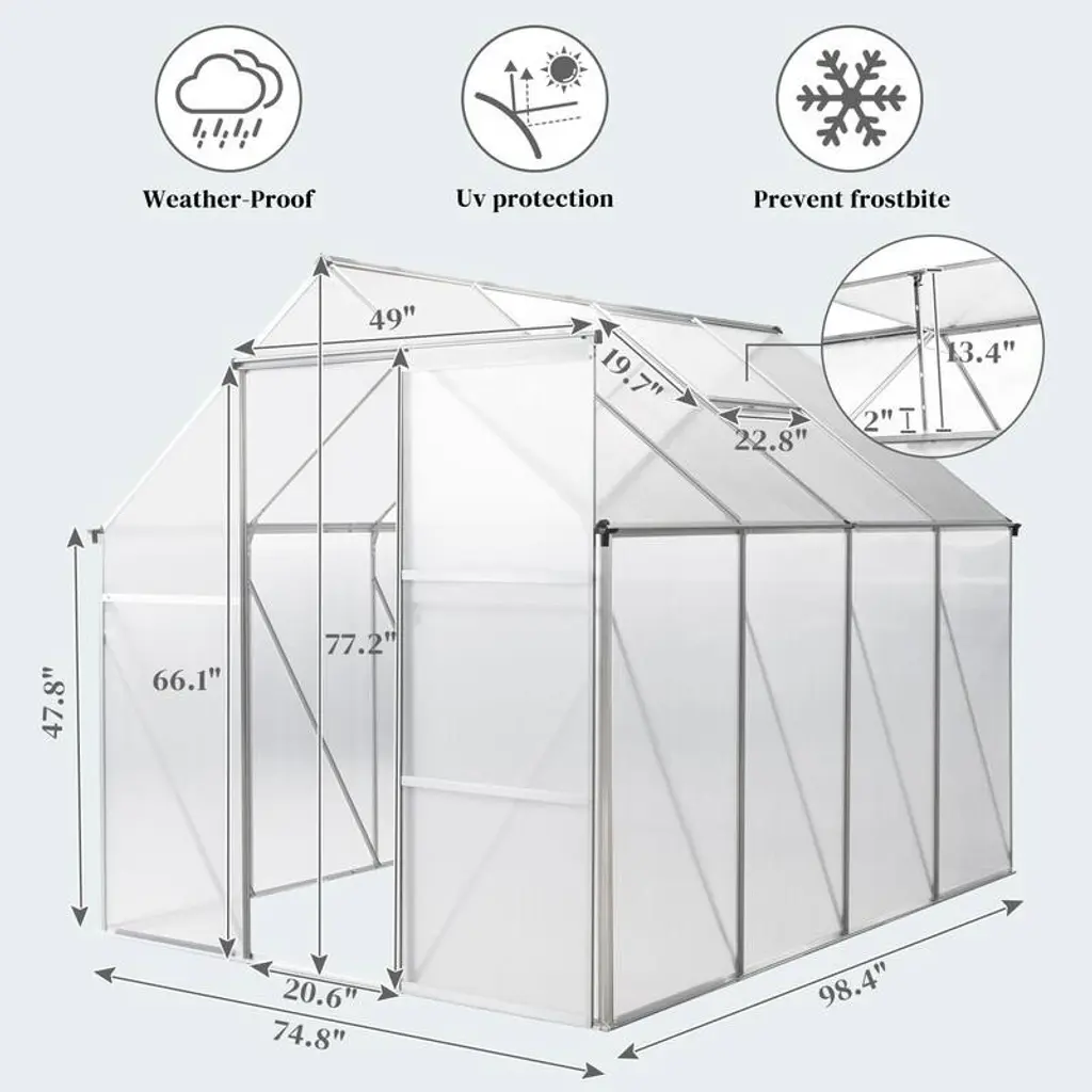 Looking forward to this 8x6ft walk-in greenhouse? The greenhouse has a sliding door for entry and exit, skylights to open and breathe, and most importantly, this greenhouse will keep your plants at a steady humidity and keep your plants from frost in the winter. The foundation is not included.