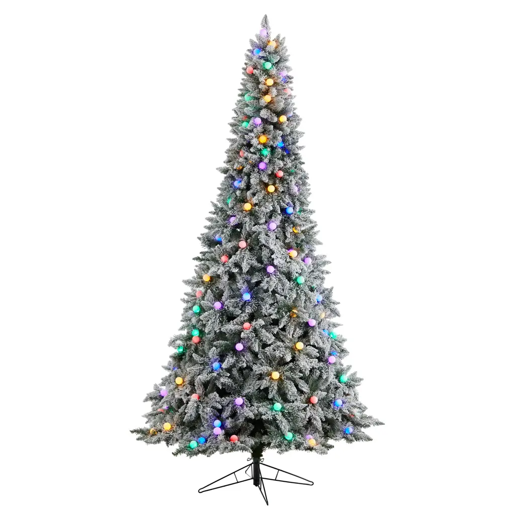 Bring the Canadian forest's rustic charm home with the help of this Flocked British Columbia Mountain Fir Artificial Tree. This realistic tree is flocked, recreating a winter wonderland setting. The 2297 easy-to-bend branches allow you to shape and fluff as you like while the 150 multi color globe bulbs add a fun colorful touch - saving you time and money. Standing at 9.5' from a metal stand, pair in an area with high ceilings.