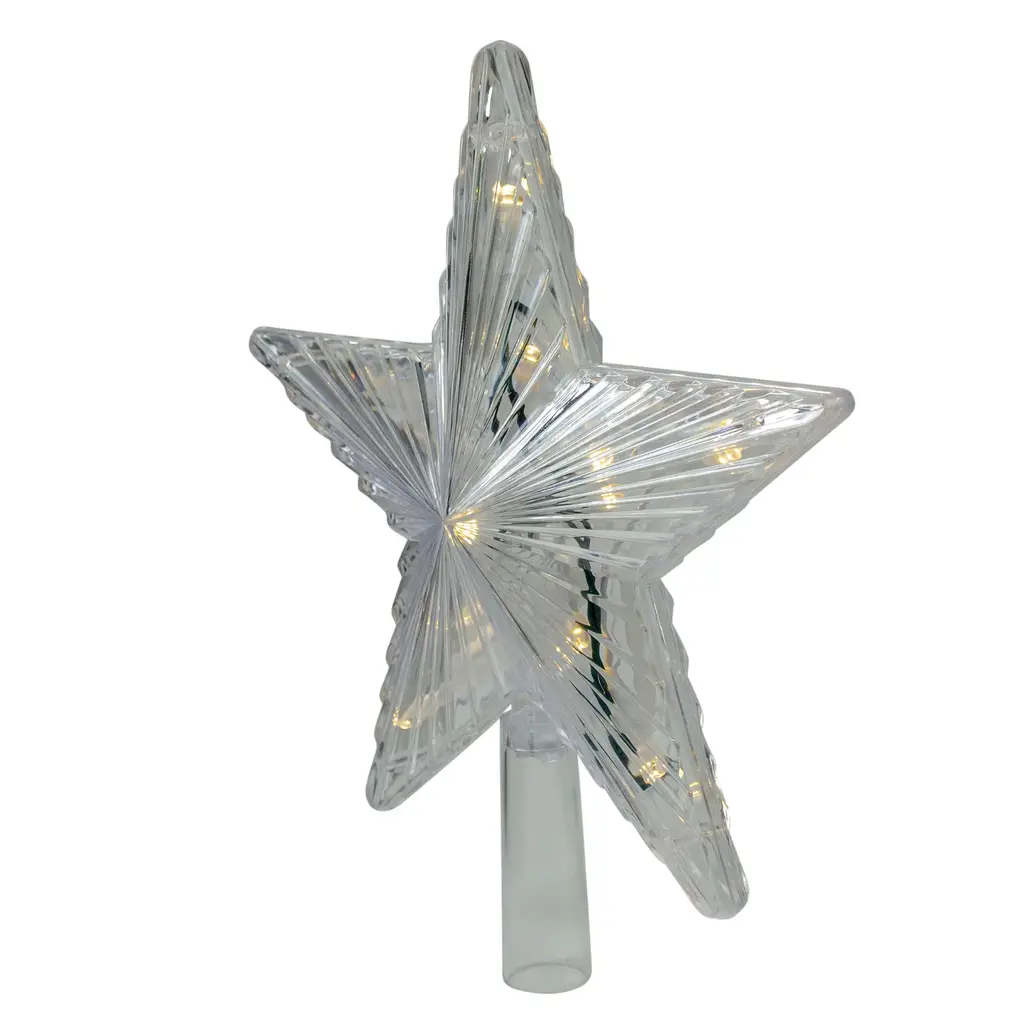 Light up your holiday decor with this beautiful lucid tree topper! The multi-colored and bright lights illuminate not only the star itself but the surrounding branches of your tree. The lights can be set into four different modes including constant and twinkling with clear and multi-colored. Product Features: LED motion star Christmas tree star Color: clear bulbs/green wire Number of bulbs: 12 Bulb size: mini 34" green lead cord Double-sided design 4-functions include: steady on multi steady on white mixing color and multi/white color changing Recommended for indoor or outdoor use < B>Additional product features: UL certified and approved for indoor or outdoor use Contains 1 plug with end connector allowing you to stack multiple sets of lights together DC 24V/3W transformer 120 volts 60 hertz .07 amps 8.4 watts Dimensions: 9.5"H x 8.75"W x 2"D Material(s): plastic/glass bulbs/wire