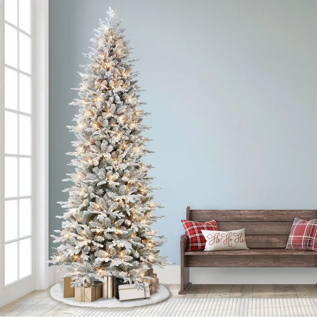 Create a magical winter wonderland in your home with this stunning Christmas tree. Adorned with elegant snow-dusted pine needles, it captures the enchanting ambiance of wintry forests. Pre-attached clear incandescent lights provide a dazzling festive glow, saving you time and effort. Enjoy worry-free celebrations with flame-retardant, hypoallergenic, and needle-shed-resistant foliage. Bring the joy and magic of the holiday season to life with this beautiful and safe Christmas tree. Product Features: Pre-lit with 600 clear lights Bulb size: mini Bulb type: incandescent 3181 branch tips Black lead cord Accented with flocked fir Additional Product Features: Slim profile tree Hinged branch construction UL-certified and approved For indoor use only Easy assembly (including stand) Flame-retardant, hypoallergenic, and needle-shed resistant Care Instructions: spot clean Dimensions: 9’ high (from the base of the stand to the top of the tree) 50" base diameter (at the widest point) Material(s): PVC/metal/glass bulbs/wire Note: Branches are compressed for shipment, and need to be fluffed out upon arrival to look like the photo.