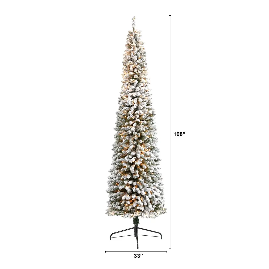 Create a winter wonderland scene in a limited space environment with the help of this flocked artificial Christmas tree! Perfect for the smallest, tightest spaces because of its narrow, pencil-like design, it boasts a tight silhouette made up of 896 easy-to-bend branch tips for showcasing your favorite holiday ornaments, all beautifully flocked with faux snow to help evoke the ultimate winter setting. Arriving pre-strung with 600 clear LED lights to eliminate tangles and carefully stabilized on a metal stand, this space-saving 9' tall flocked artificial Christmas tree will not only make decorating a breeze but ensure your home is looking picturesque all throughout the holiday season - no matter your space situation.