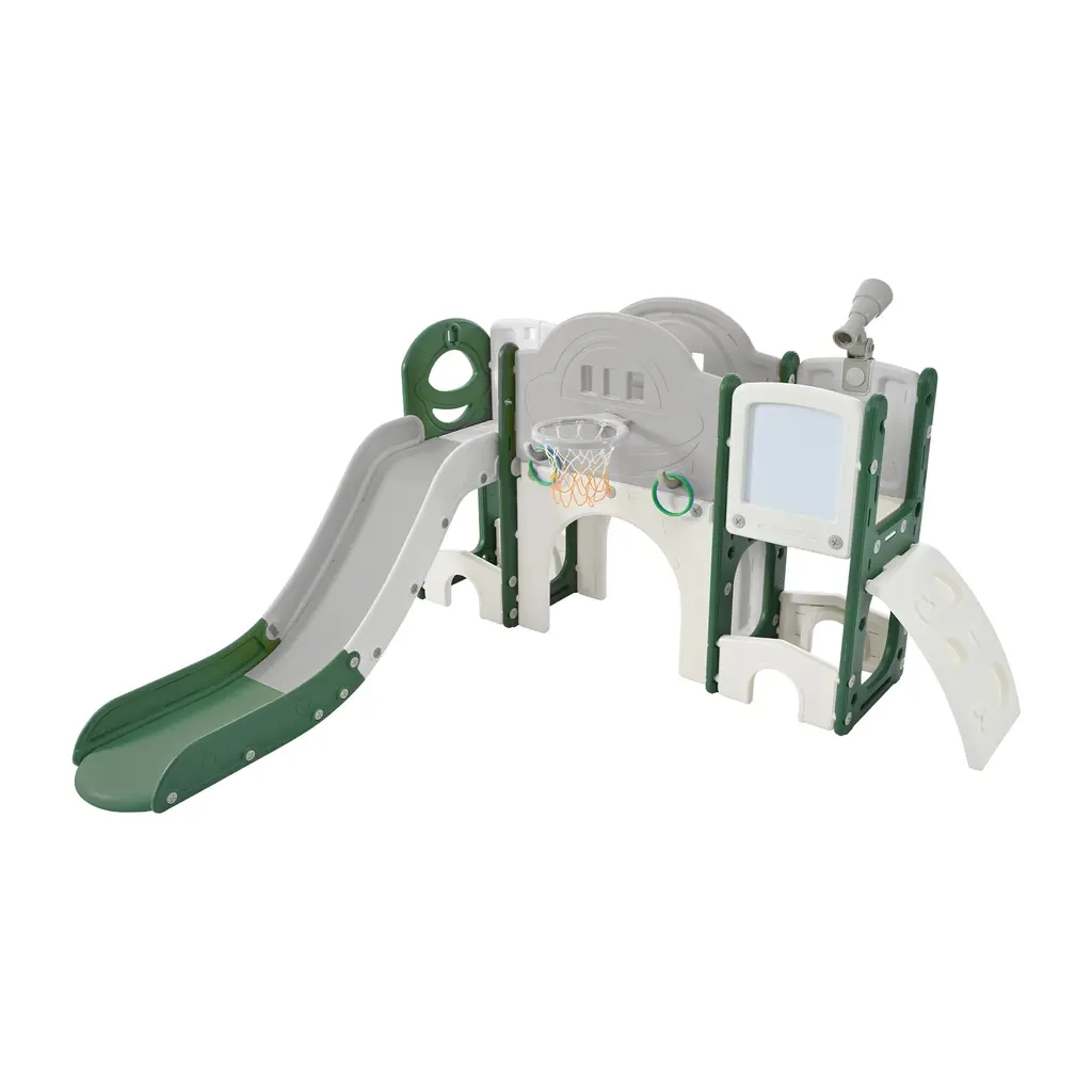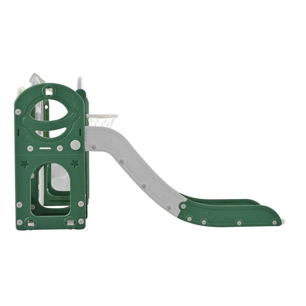Specification:Description:Transform your child's playtime with the innovative 9-in-1 Kids Slide Play set Structure, designed to spark imagination and promote physical activity. This versatile spaceship-themed play set includes a slide, arch tunnel, ring toss, drawing whiteboard, and basketball hoop, providing endless fun for toddlers and young children. Crafted from durable HDPE material, it is perfect for both indoor and outdoor use, ensuring hours of safe play. Available in a variety of vibrant color combinations—White-Grey, Grey-Blue, Yellow-Green, Grey-Green, and Grey-Pink—this play set enhances any play area while encouraging creativity and active engagement. Watch as your little ones climb, slide, and explore their new playground, all while developing essential motor skills and social interactions.