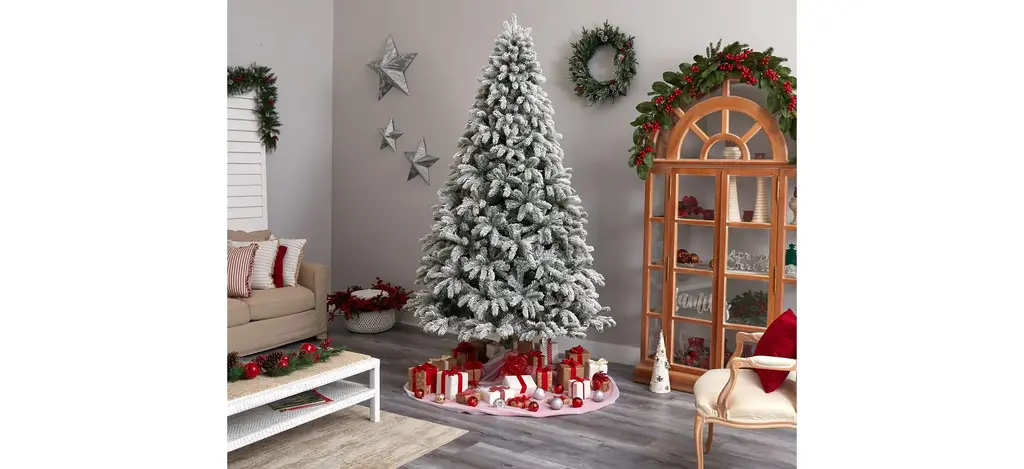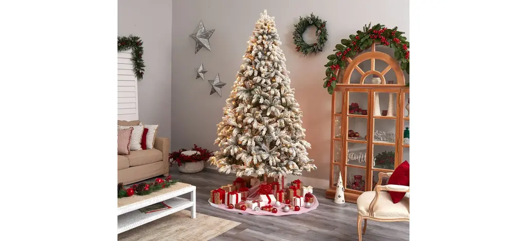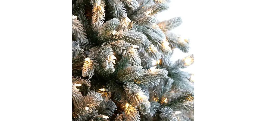 Evoke a winter wonderland this season with the help of the 9' Pre-Lit Flocked South Carolina Spruce Artificial Tree . Easy to set-up and entirely maintenance-free, this winter-inspired artificial Christmas tree boasts a robust silhouette of realistic looking foliage