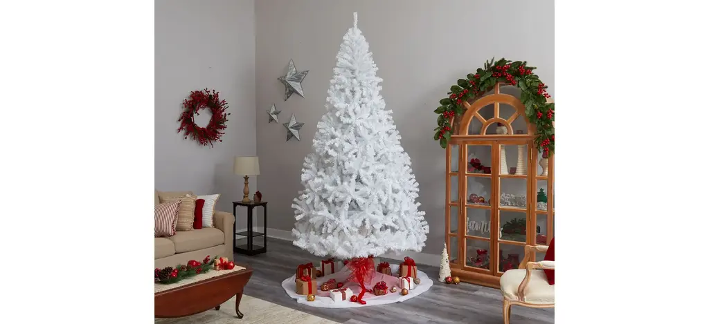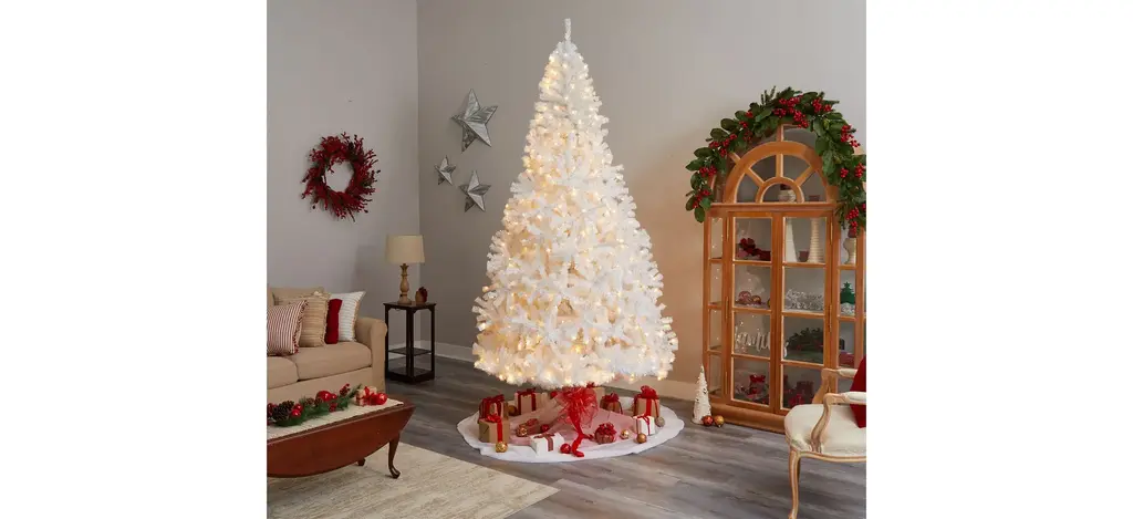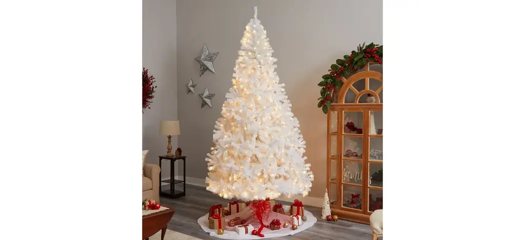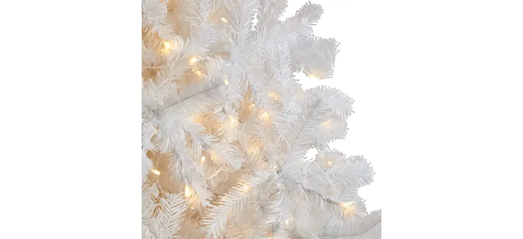 Complete a winter-inspired Christmas decor scheme this holiday with the help of the 9' Pre-Lite White Artificial Tree. Completely maintenance-free, this all-white fake Christmas tree boasts an array of soft looking foliage