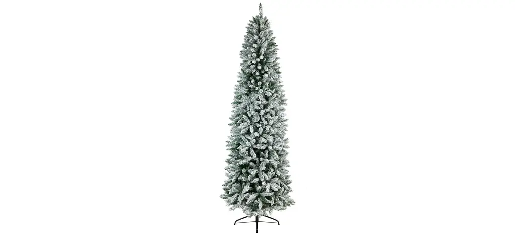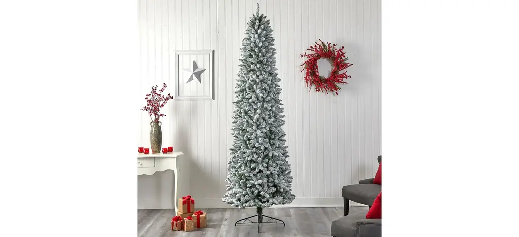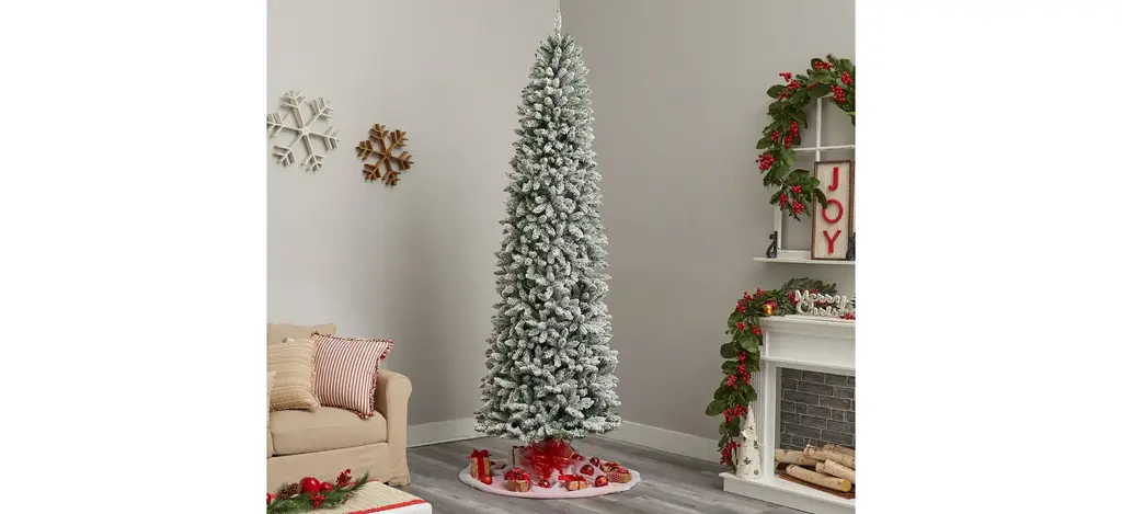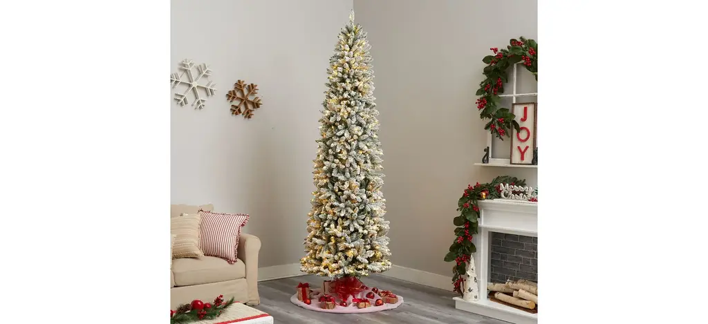 Transform your home into an enchanting winter wonderland with this flocked 9" Slim Flocked Montreal Fir Artificial Christmas Tree with Warm White LED Lights and Bendable Branches. If you dream of a white Christmas, this artificial tree is designed to mimic the texture and foliage of real trees with their upward sloping branches. Pre-strung with 600 LED lights for a warm, candle-like glow, all that's missing are your ornaments. Standing at 9", this flocked tree complements spaces that need some Christmas love. Everyone can have a white Christmas even if they live in the tropics. Your artificial Christmas Tree will look beautiful for years to come; simply wipe clean with a soft dry cloth when needed.