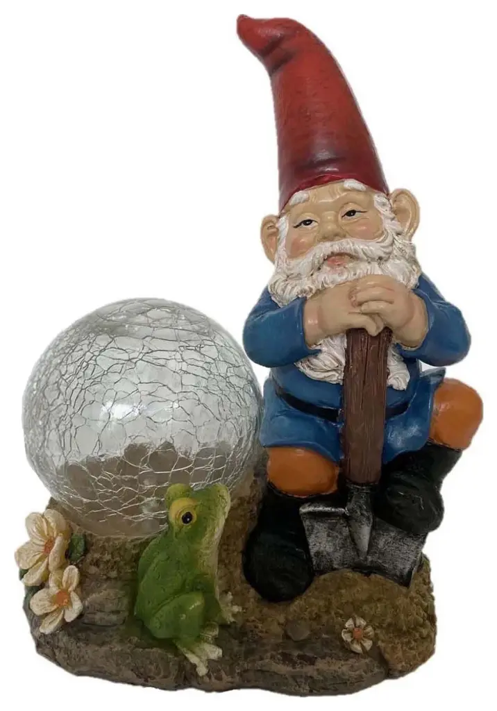 It''s always good to take a break when you''re working hard, and while you''re on a break, it''s always good to tell a story! A little frog sits attentively while the gardener gnome relaxes beside a gazing ball and tells tales of long ago. The solar powered gazing ball lights up in various colors and is powered by an included AA rechargeable battery. Made of long lasting resin and beautifully hand painted, this 9" Solar Garden Gnome is sure to provide many seasons of pleasure.