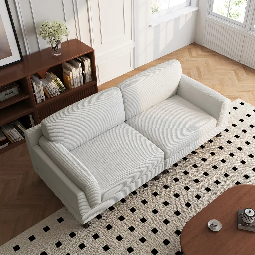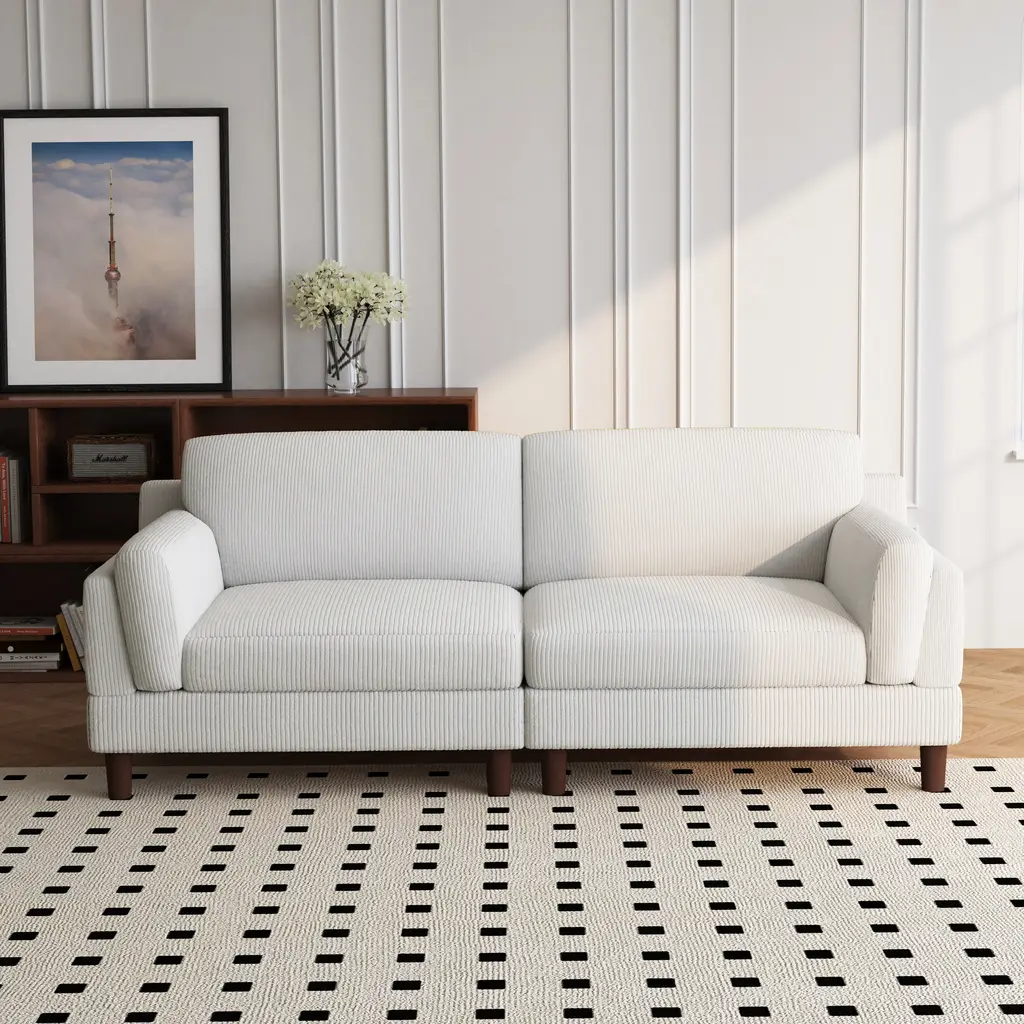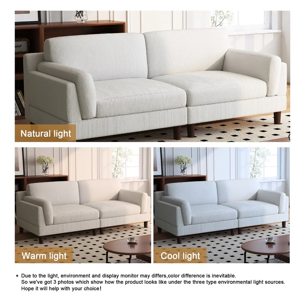 Experience ultimate comfort and craftsmanship with our oversized living room loveseat sofa! Measuring 69.4 inches wide by 29 inches deep, this plush sofa offers ample space for 2-3 adults to relax. The sleek lines and premium materials combine to create a trendy and inviting resting place.The plush cushions, including two backrest cushions and armrest cushions, provide a sumptuous seating experience. The corduroy cover adds a tactile and velvety touch, enhancing the coziness of your living room. Easy to assemble with all tools included, this sofa is the perfect addition to any home! Features: Enhanced Comfort: Improved polyester fiber and independently wrapped coils filling enhance comfort and durability, ensuring a delightful seating experience. Superior Craftsmanship: The sofa's unique appearance and fashionable lines, combined with premium fabric and fillings, create a trendy and comfortable resting place. Luxurious Upholstery: Upholstered with corduroy fabric, our loveseat sofa offers a soft and plush texture, inviting relaxation and comfort. Sturdy Construction: Reinforced wood base and 800 lbs weight capacity ensure durability and longevity. Easy Maintenance: Easily clean the sofa with a wet towel and a soft brush, following the direction of the fluff, for hassle-free maintenance. Information: Dimensions: 90" W x 35.4" H x 41.2" D Color Options: Green, Grey, Orange, Beige, Light Grey Upholstery Material: Corduroy Weight Capacity: 800 lbs