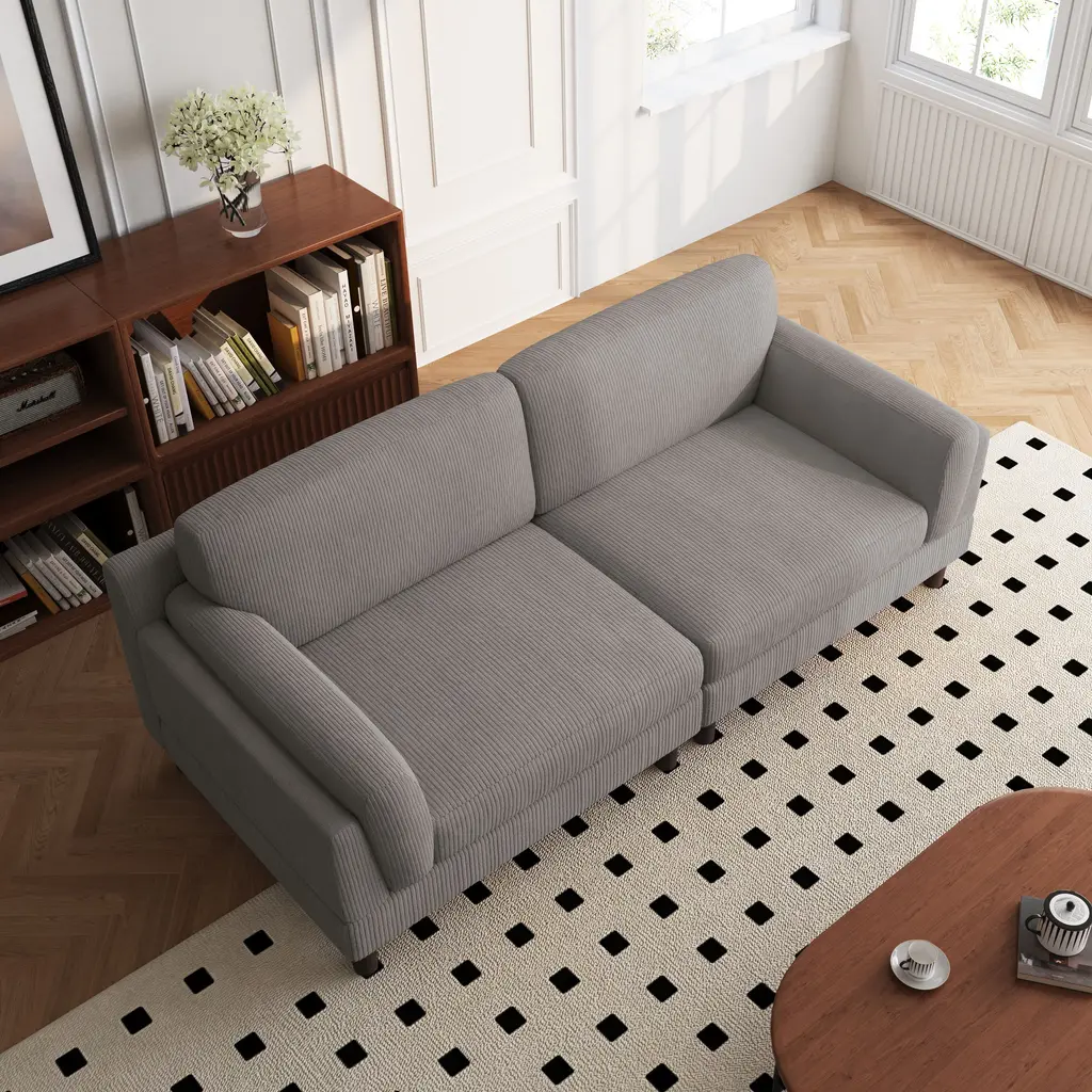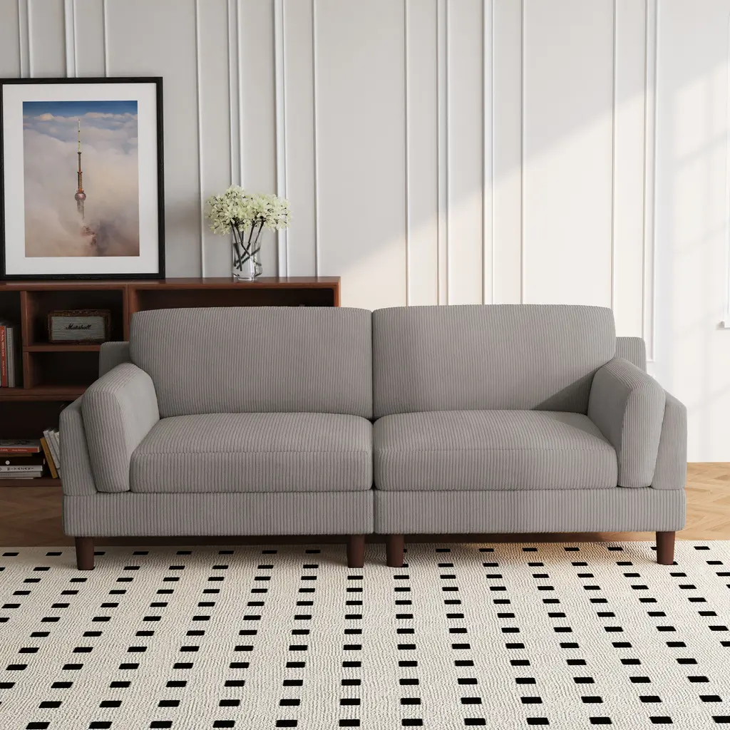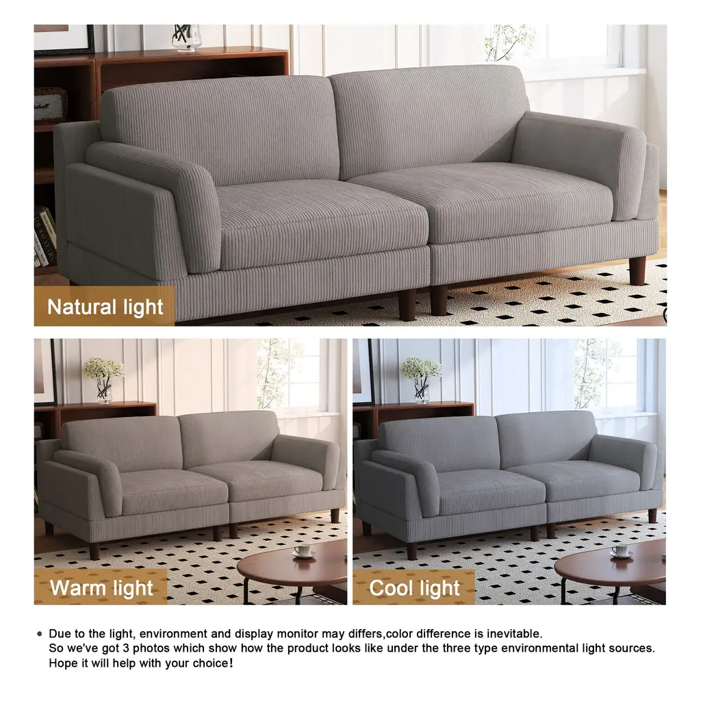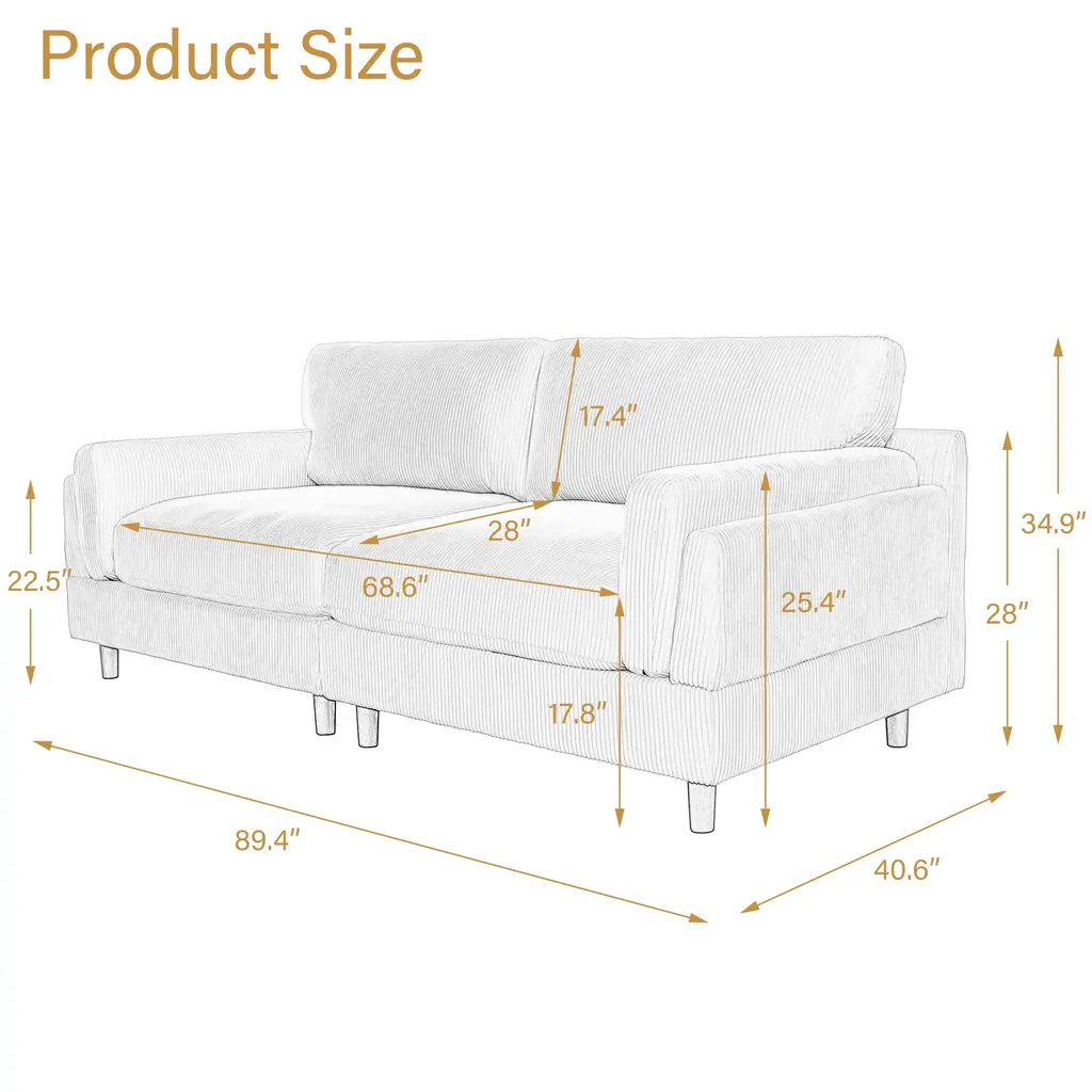 Experience ultimate comfort and craftsmanship with our oversized living room loveseat sofa! Measuring 69.4 inches wide by 29 inches deep, this plush sofa offers ample space for 2-3 adults to relax. The sleek lines and premium materials combine to create a trendy and inviting resting place.The plush cushions, including two backrest cushions and armrest cushions, provide a sumptuous seating experience. The corduroy cover adds a tactile and velvety touch, enhancing the coziness of your living room. Easy to assemble with all tools included, this sofa is the perfect addition to any home! Features: Enhanced Comfort: Improved polyester fiber and independently wrapped coils filling enhance comfort and durability, ensuring a delightful seating experience. Superior Craftsmanship: The sofa's unique appearance and fashionable lines, combined with premium fabric and fillings, create a trendy and comfortable resting place. Luxurious Upholstery: Upholstered with corduroy fabric, our loveseat sofa offers a soft and plush texture, inviting relaxation and comfort. Sturdy Construction: Reinforced wood base and 800 lbs weight capacity ensure durability and longevity. Easy Maintenance: Easily clean the sofa with a wet towel and a soft brush, following the direction of the fluff, for hassle-free maintenance. Information: Dimensions: 90" W x 35.4" H x 41.2" D Color Options: Green, Grey, Orange, Beige, Light Grey Upholstery Material: Corduroy Weight Capacity: 800 lbs