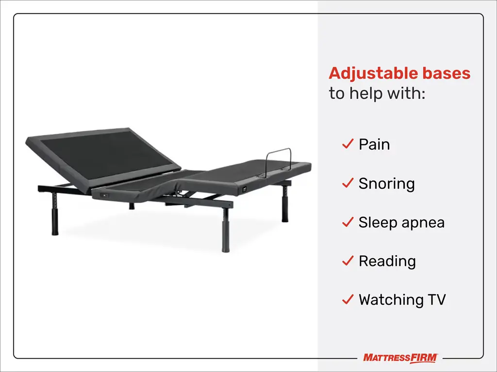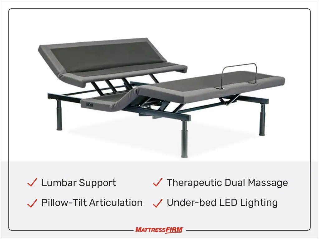 Experience unparallel sleep at an economical price with the Mattress Firm® 900 Adjustable Base. The head and feet up positioning may help relieve aches, and pains while the edge to edge lumbar section can provide superior back support. The Mattress Firm 900 is the best adjustable bed for the person who enjoys watching TV, reading or even eating in bed; the base is equipped with Therapeutic Dual Massage, Under Bed LED Lighting, voice-powered app to control the base and so much more. The adjustable base features three per-set positions or program your own ideal position with the remote customizing the base to fit your personal sleep needs. Protect your adjustable base with FirmCare Protection Plan.
