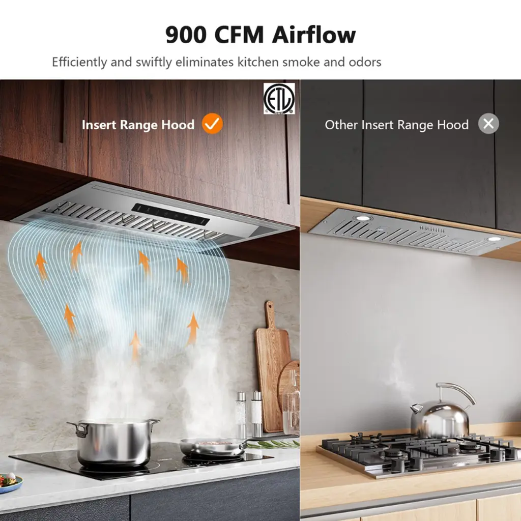 900 Cfm Convertible Insert Range Hood Stainless Steel With Baffle Filters, Led And Gesture Control
