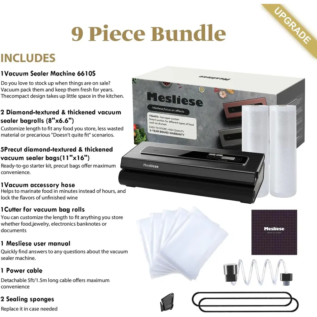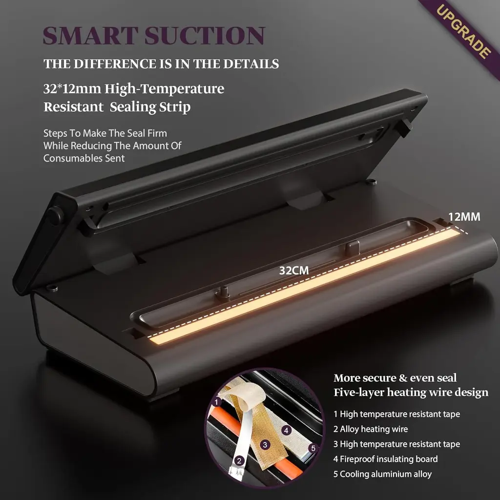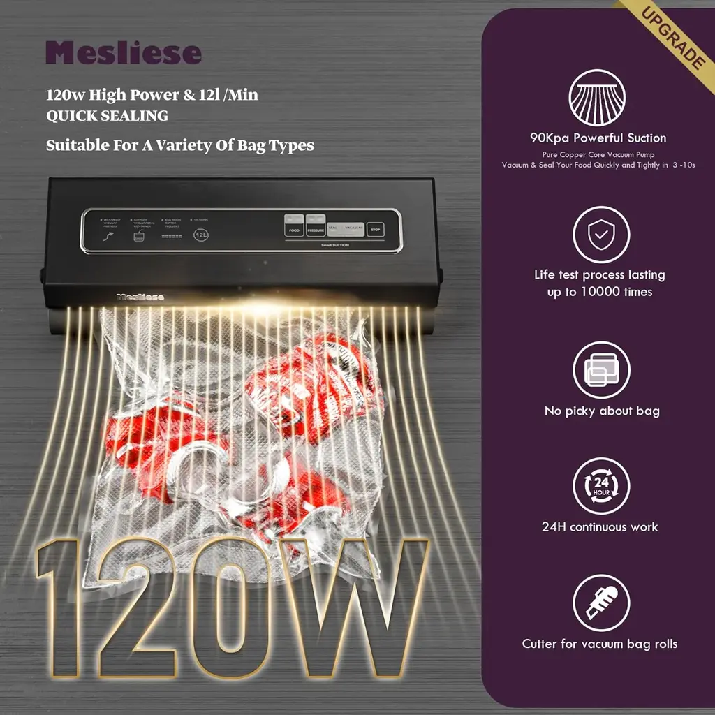 Keep Food Fresh and Save Money: The vacuum sealer machine is designed to provide a powerful suction with max 90kPa, making it much easier and quickly to vacuum all kinds of food. A more helpful way to save money and time. Keep your food or fruits fresh 10 times longer than ordinary storage methods in the freezer. 6-IN-1 Functions: 6 functions of The food sealer meet all your needs to preserve various kinds of food. "Dry&Moist" Modes and "Normal&Soft" Modes for you to choose depend on the food types. "SEAL" and "VAC&SEAL" Methods are for only sealing or vacuuming & sealing the bag. What's more, you can also use the vacuum tube for vacuuming canisters, jars, or wine bottles. TESTED 90Kpa Powerful Suction: The vacuum sealer supports 20 times continuous sealing with 120w strong power. The heavy-duty motor provides REAL 90kpa powerful suction, vacuuming the food more tightly than ordinary machine. Vacuum time 3-10s, Sealing time 9-12s. Allows you to preserve your food with no hassle. Easy to Clean and Storage: The Stainless steel surface plus the smooth cambered vacuum chamber make it much easier to clean than other brands machines, no food residue leaving in the vacuum chamber. More convenient, healthy and clean. Unit size is 14.9*5.7*3.5 inch, compact to store. Satisfied Service: You will receive 1x vacuum sealing machine, 2x vacuum rolls (8"x6.6'), 5x pre-cut bags (BPA free, 11"x16"), 1x user manual, 1x Air suction hose, 1x AC power cable, 2x sealing sponge/gaskets.12mm Widened Heating Strip: It's designed to widen the heating strip up to 12mm with strengthen sealing material, ensuring much more tight, durable and steady sealing effect. 5-layer heating wire design offers more secure and even seal.