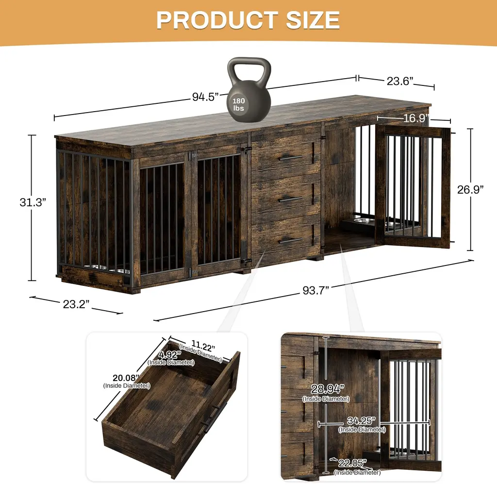 94"l X 23"w X 31"h. Ouyessir Dog Crate Furniture With Drawers & Wheels - Wood/metal - Assembly Required - Rustic Brown