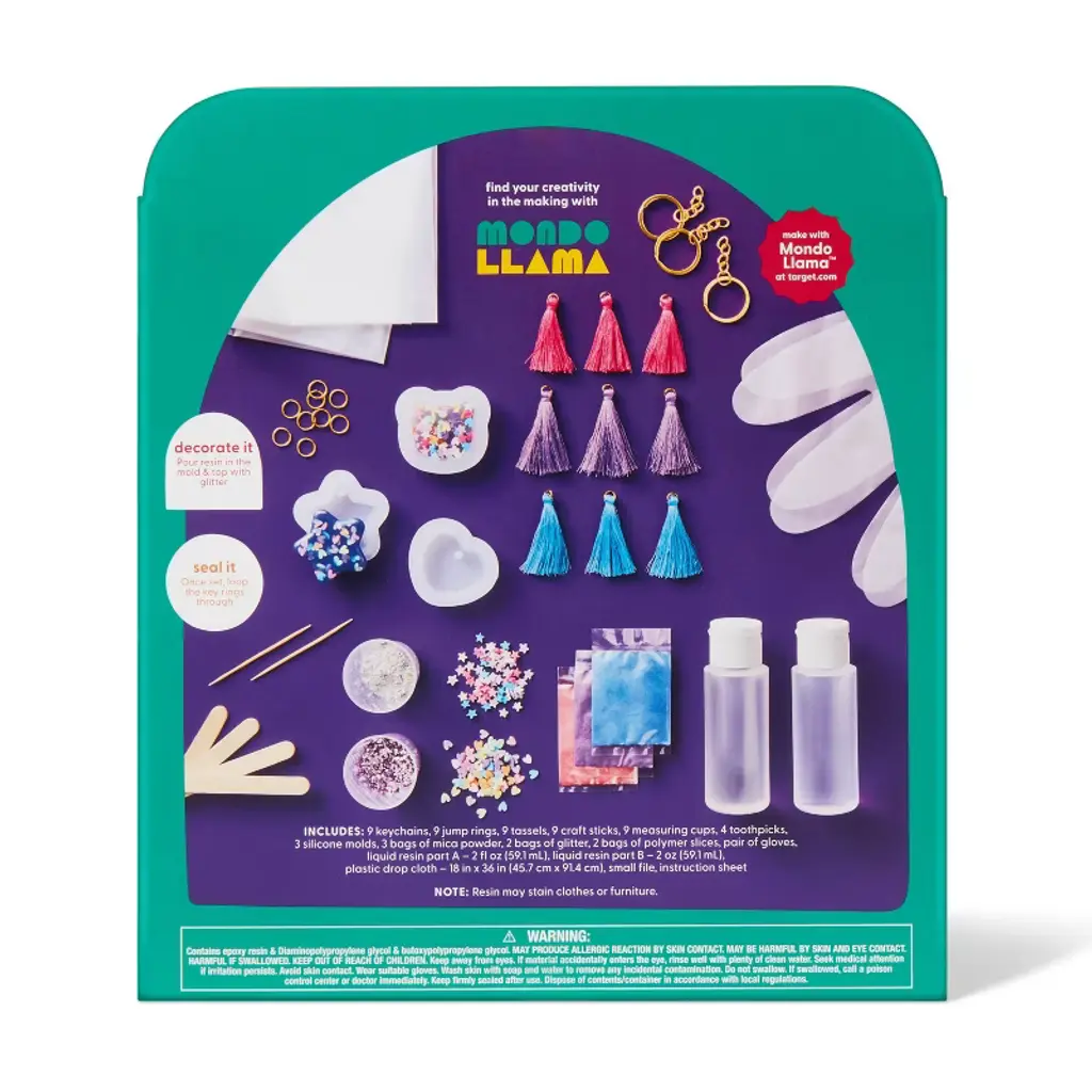 Enjoy rainy days or weekends with your kids by creating something functional and fancy with this 9-Count Resin Keychain or Bag Charm Craft Kit from Mondo Llama™. This DIY kit includes nine keychains, nine jump rings, resin, molds, drop cloth, measuring cups, craft sticks, mica powders and more, along with an instruction sheet to help guide them through the process.Mondo Llama™: Find your creativity in the making.