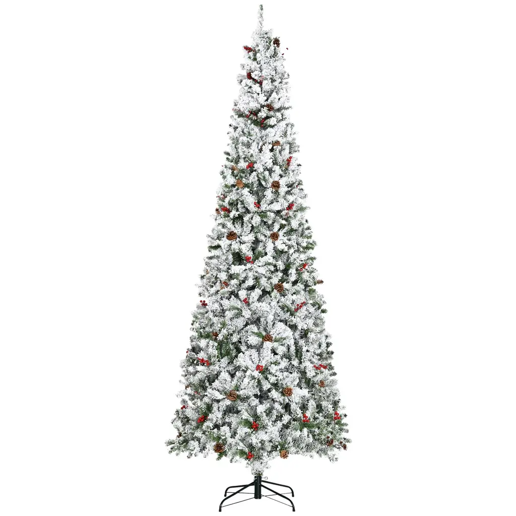 9Ft Pencil Snow Flocked Artificial Christmas Tree With Pinecones - Green