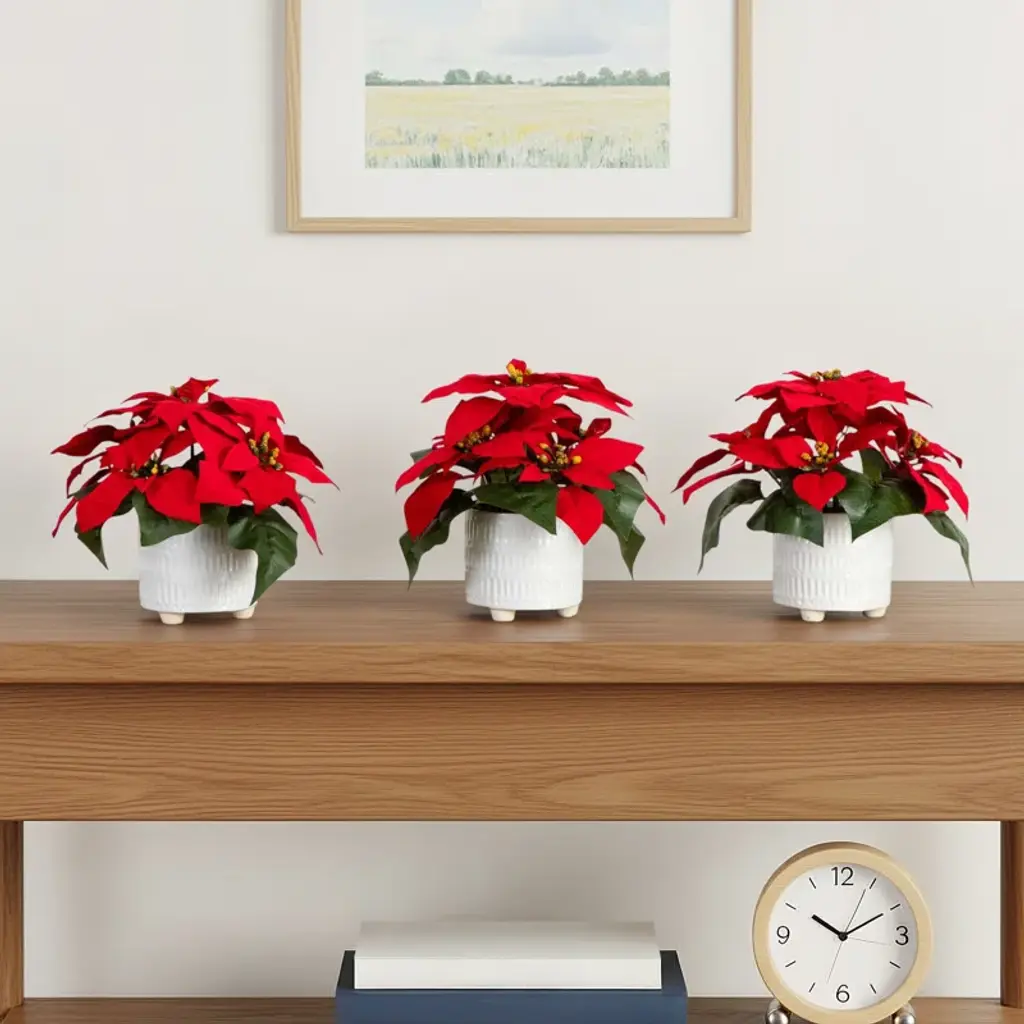 9In. Artificial Poinsettia Arrangements In White Ceramic Pots - Set Of 3