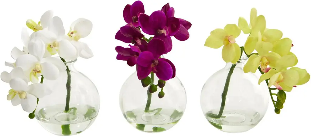 These Phalaenopsis Orchid Artificial Arrangements in Vase (Set of 3) are elegant and simple. They are also bright and beautiful, with a natural look to lighten up any space. These stand out elegantly against dark wood in an office or study.