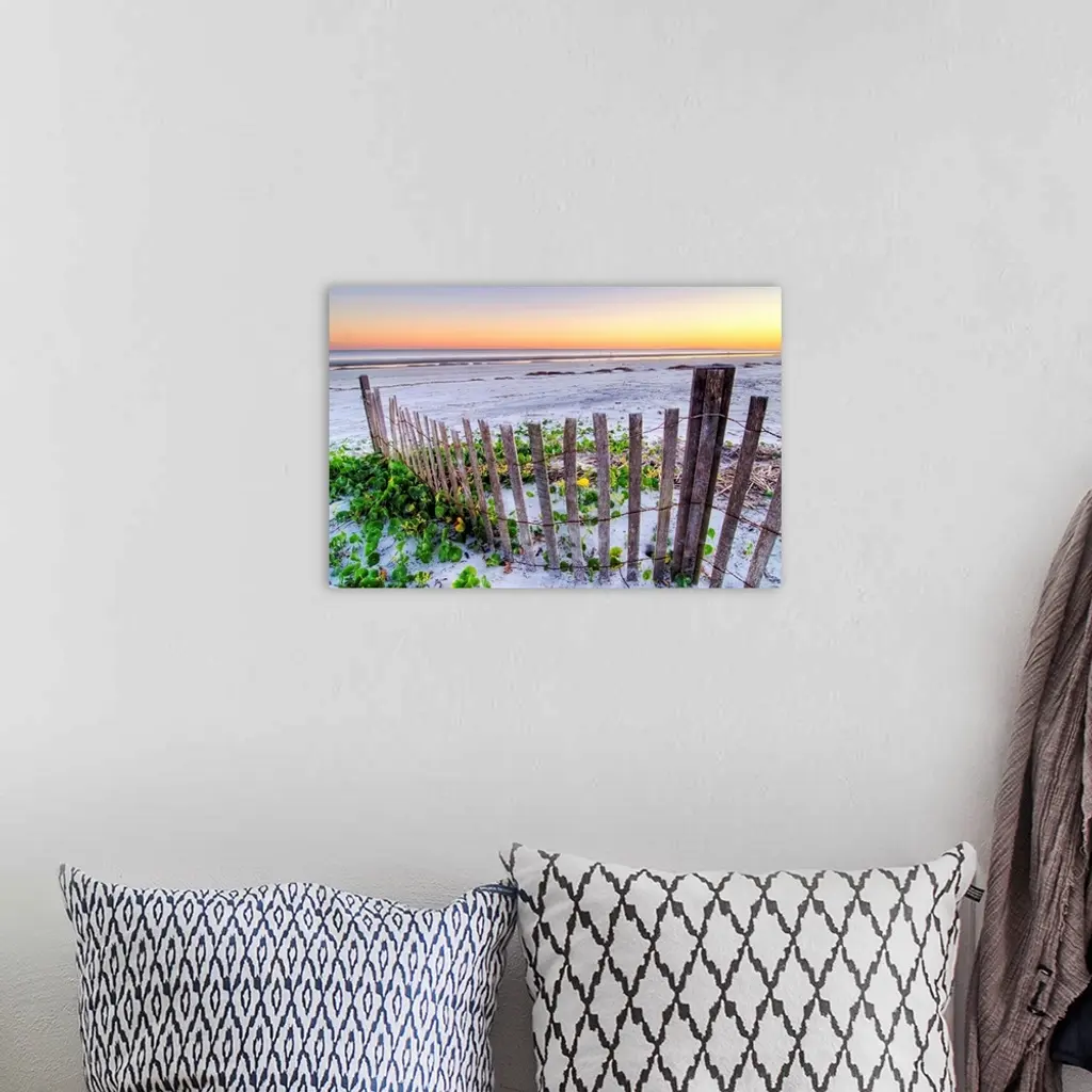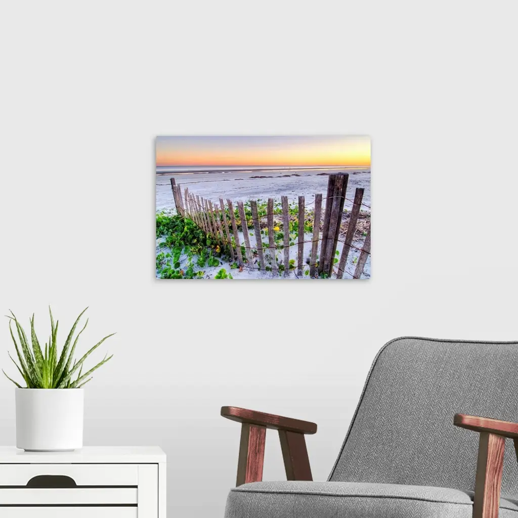 Wall art for the home or office this landscape photograph is of a battered barrier fence ends on the edge of the sandy shoreline and calm sea.