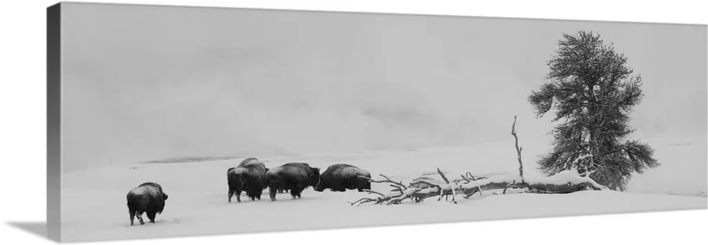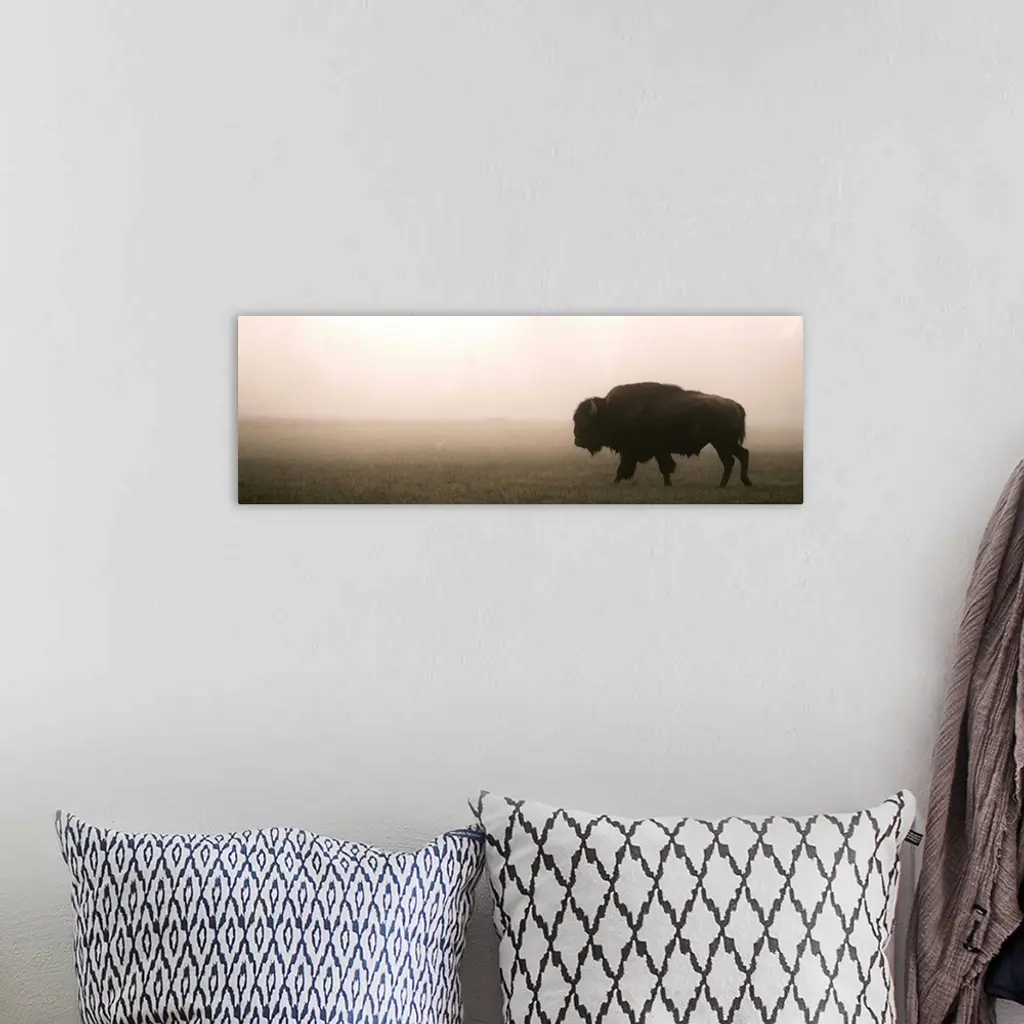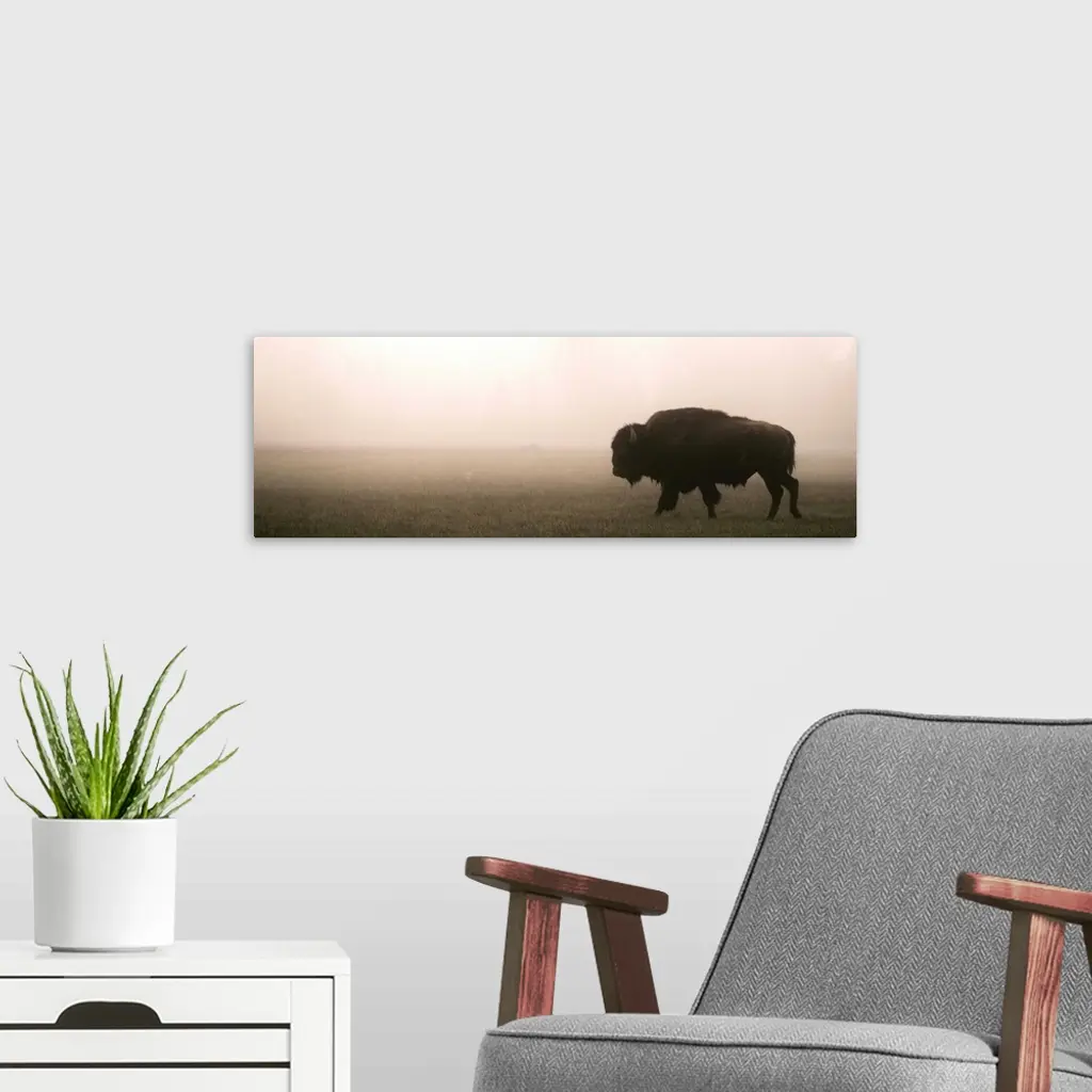 A bison in a misty field at Yellowstone National Park, Wyoming.