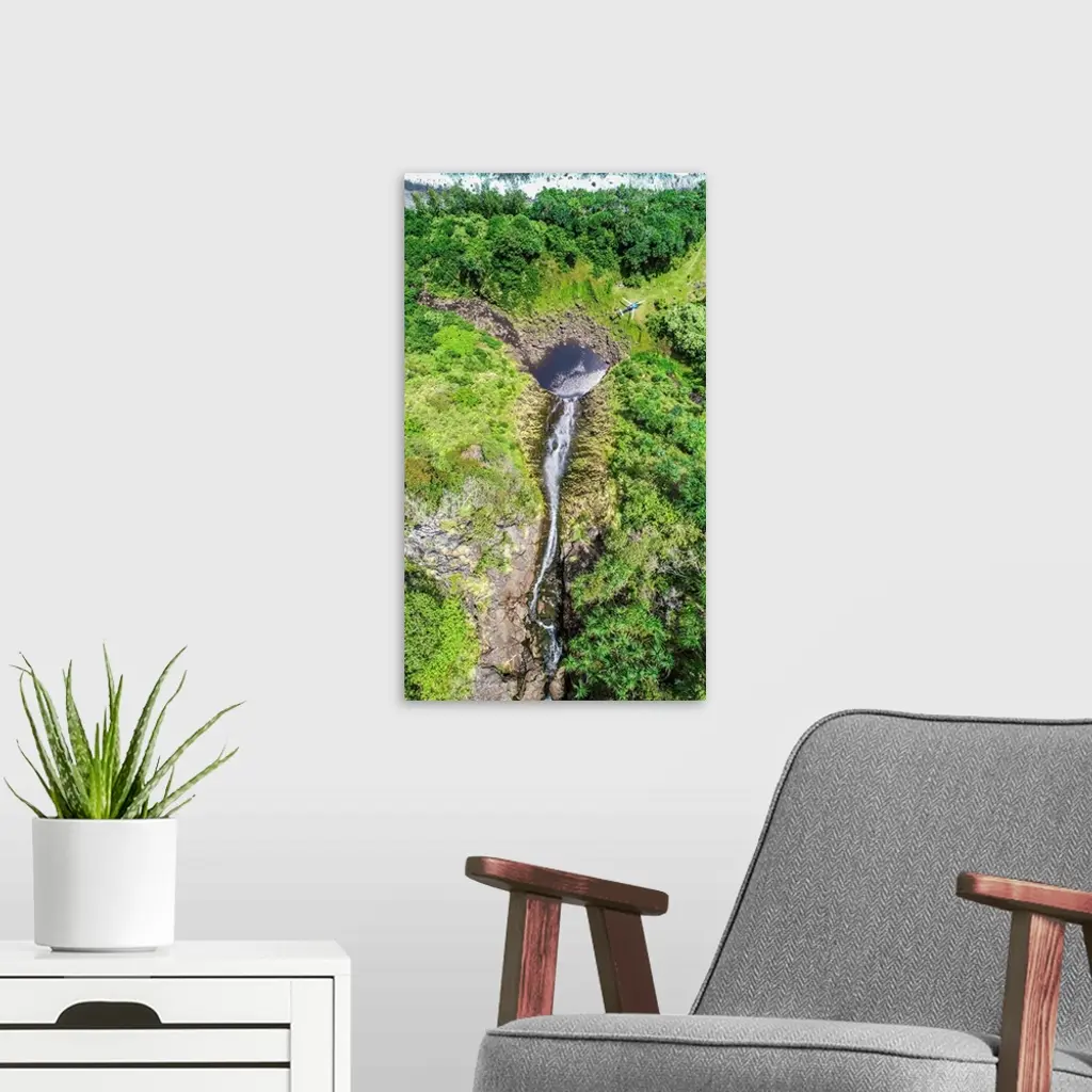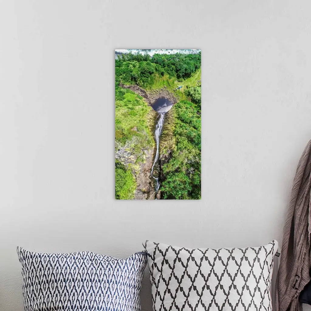 A Blue Hawaiian Helicopter Sets Down On A Remote Waterfall Near Hawaii's Shoreline
