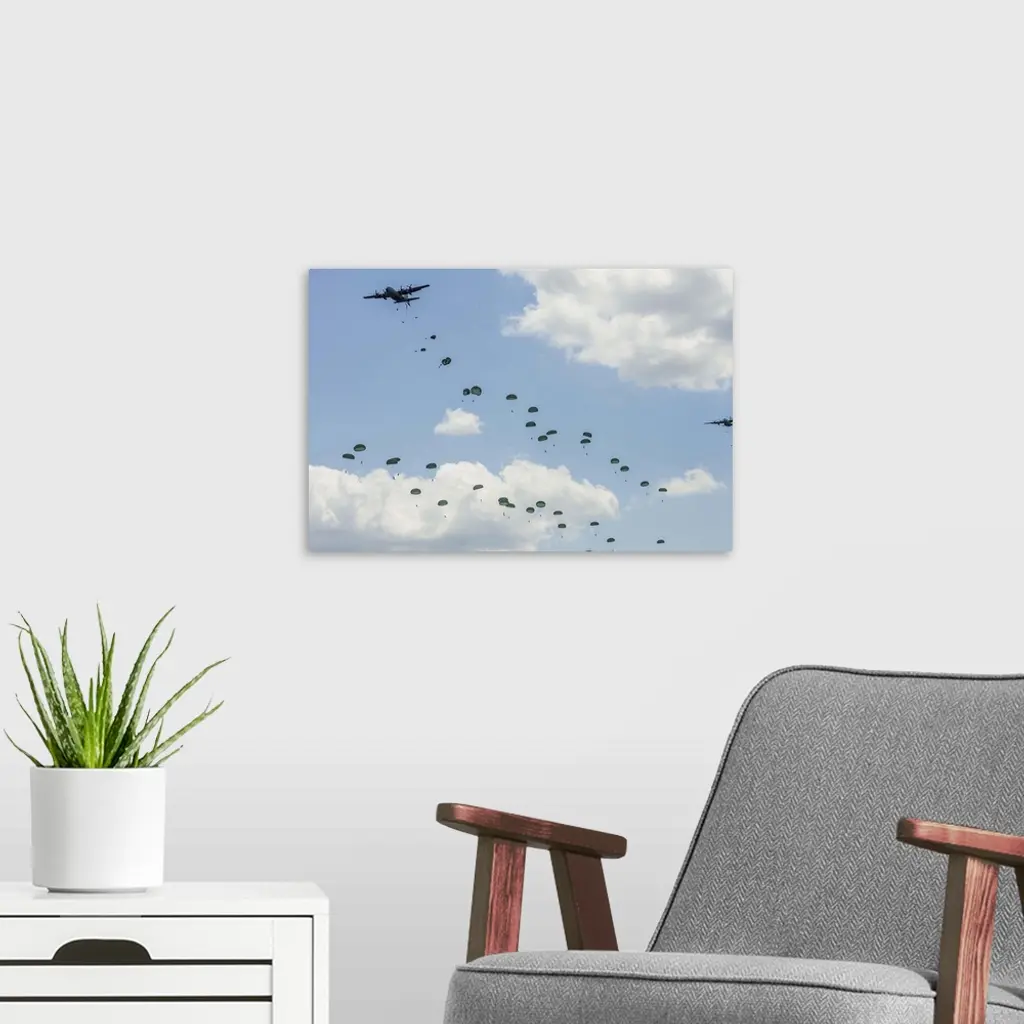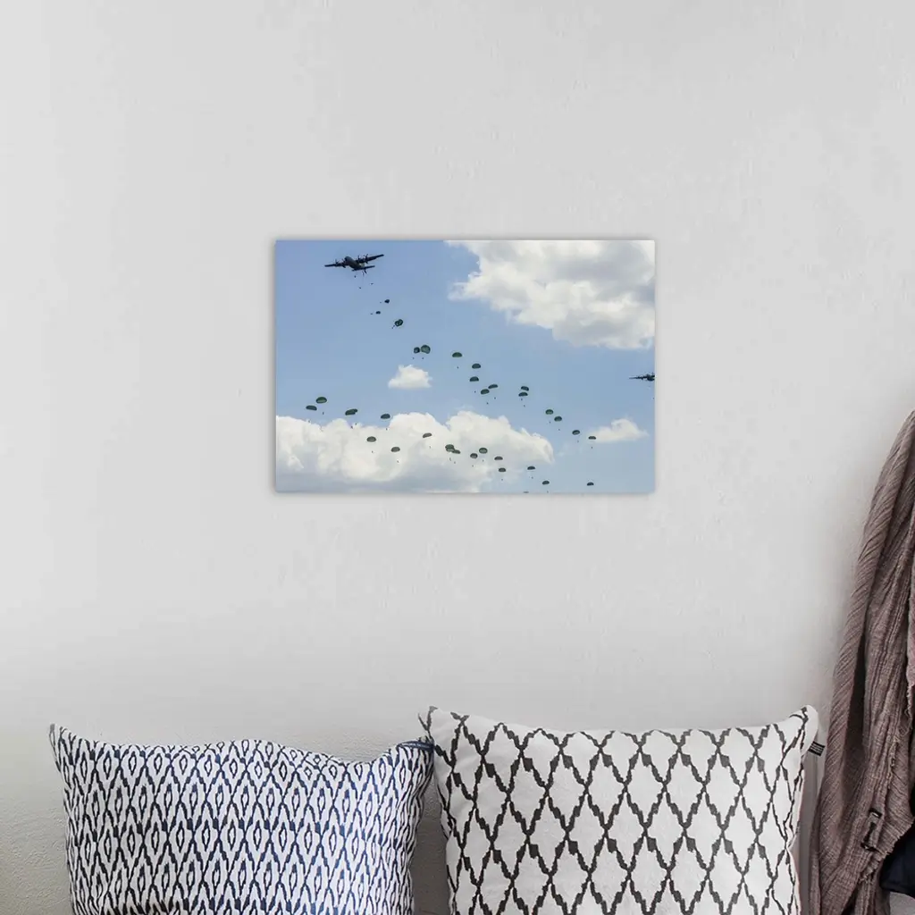 U.S. Air Force C-130 Hercules drop U.S. Army airborne troops over Andrews Air Force Base, Maryland.